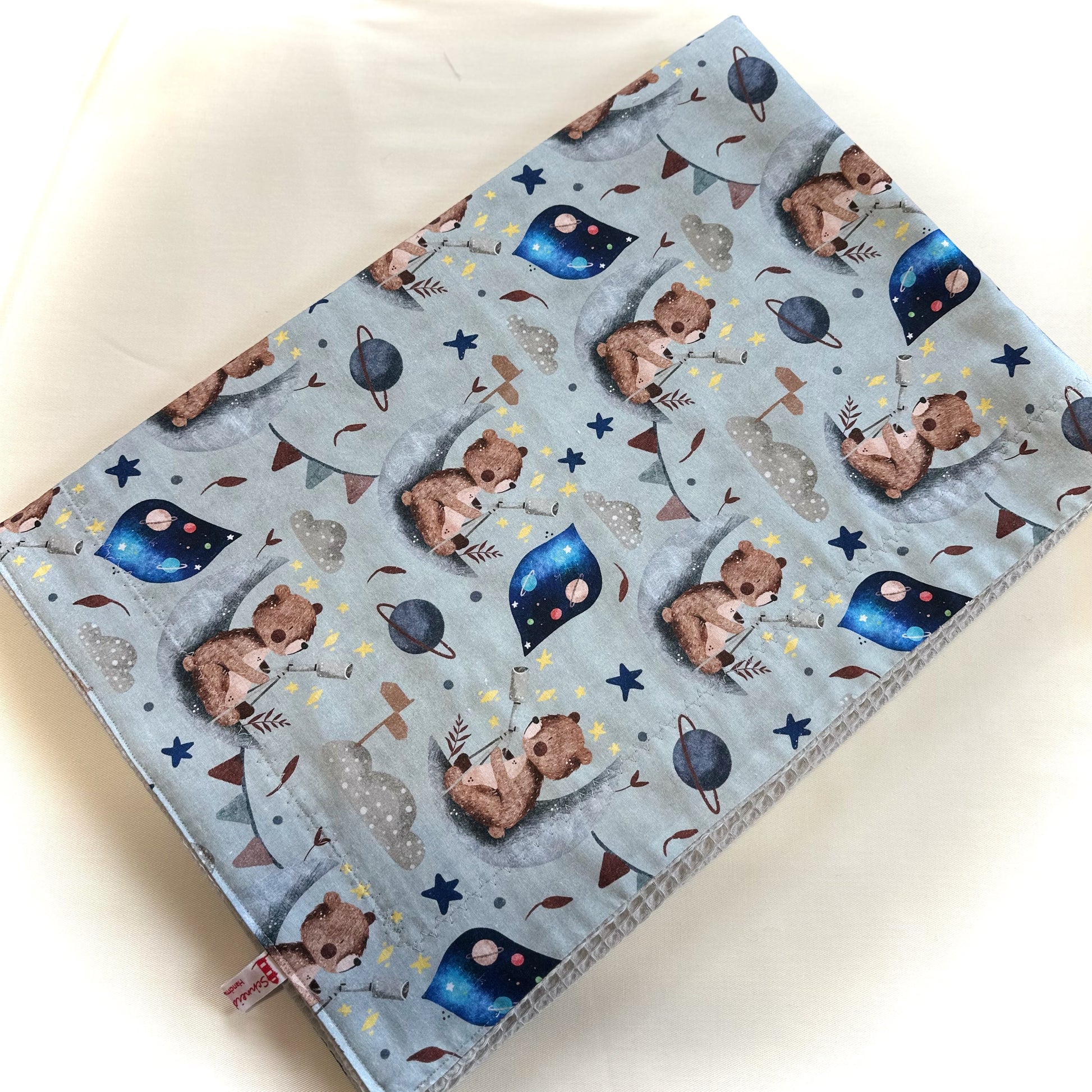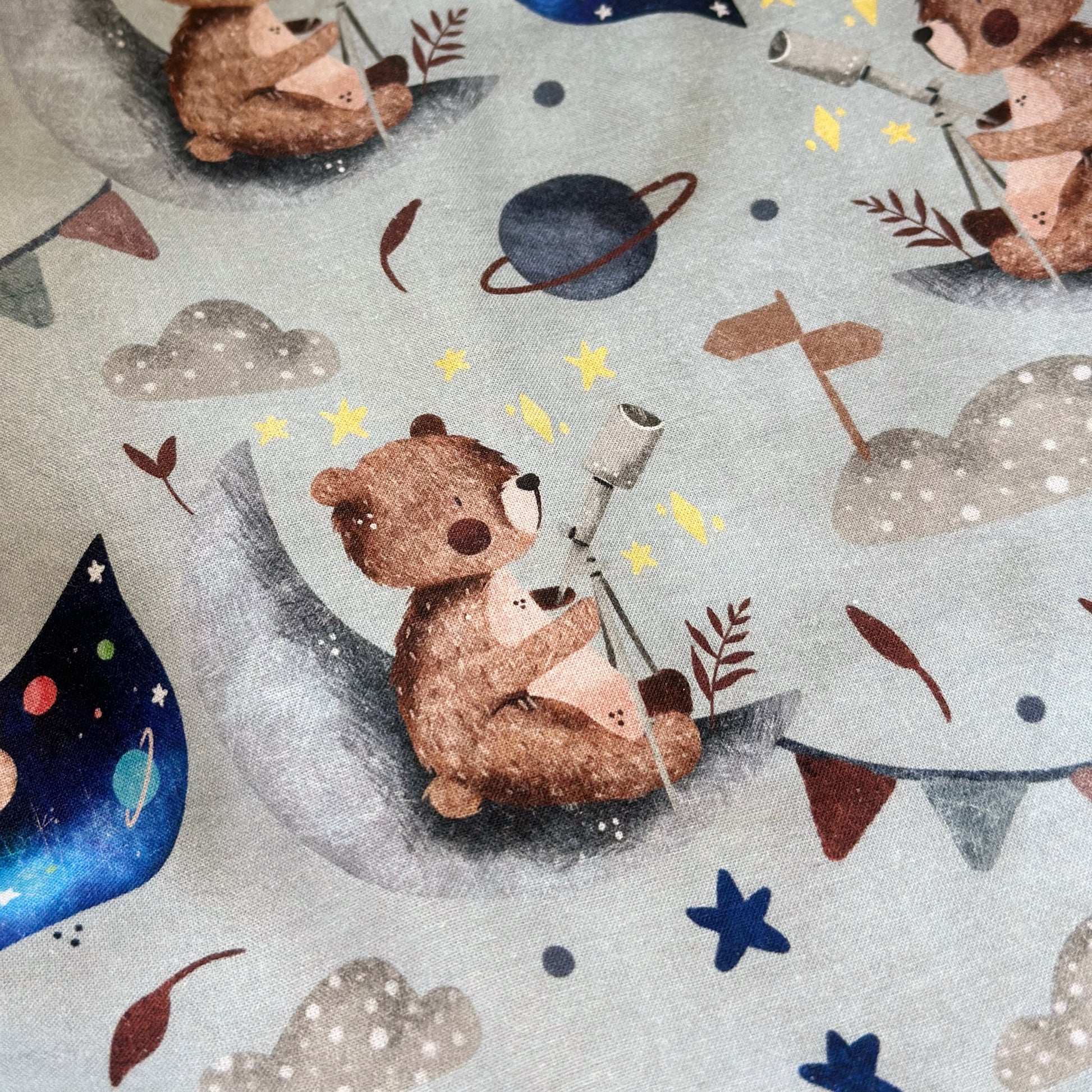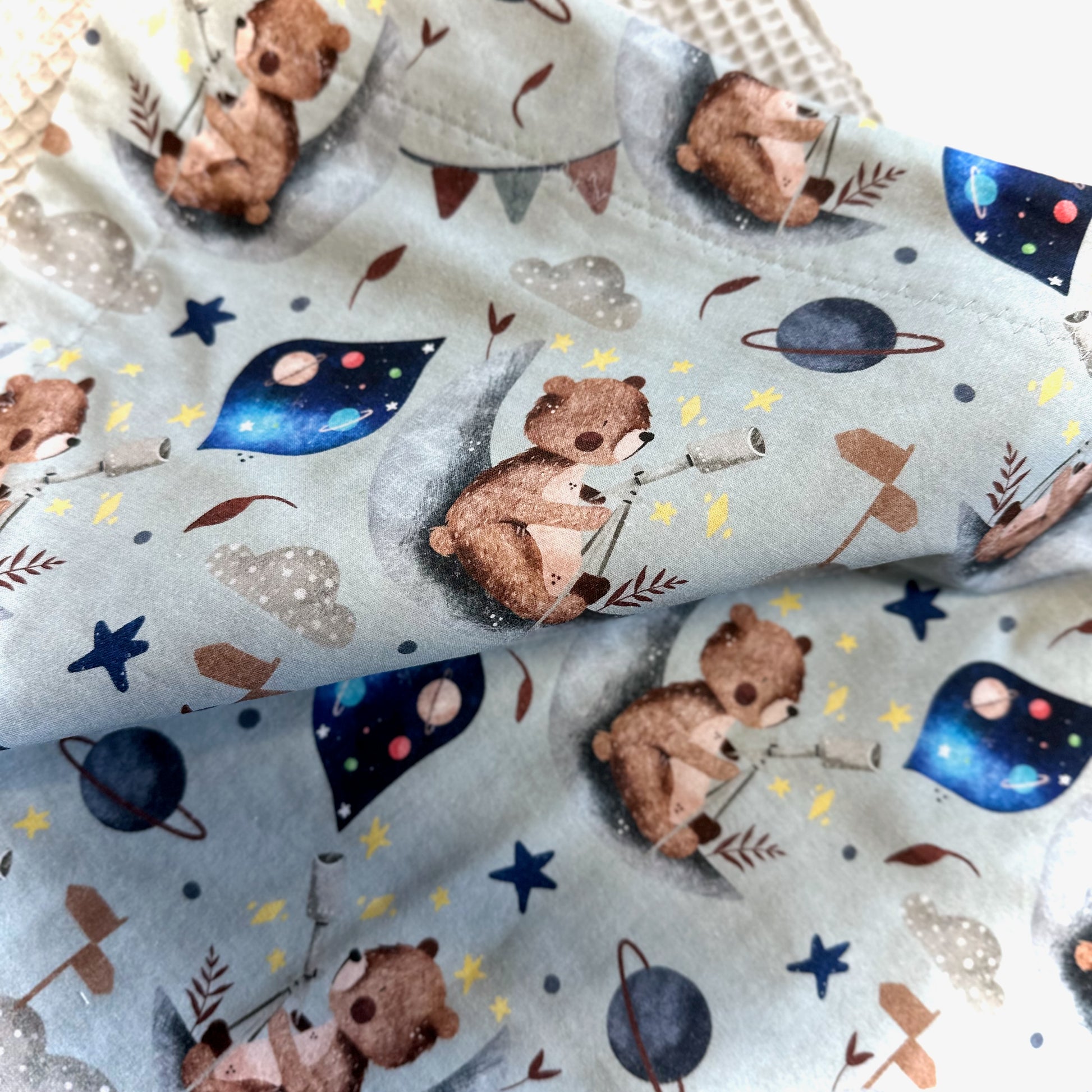 Der Baumwollstoff wurde mit ökologischer Drucktinte (GOTS 5.0 und OEKO-TEX 100) bedruckt. Der hellgraue Rücken aus Waffelpikee besteht aus 100% Baumwolle. Beide Stoffe sind OEKO-TEX 100 zertifiziert.