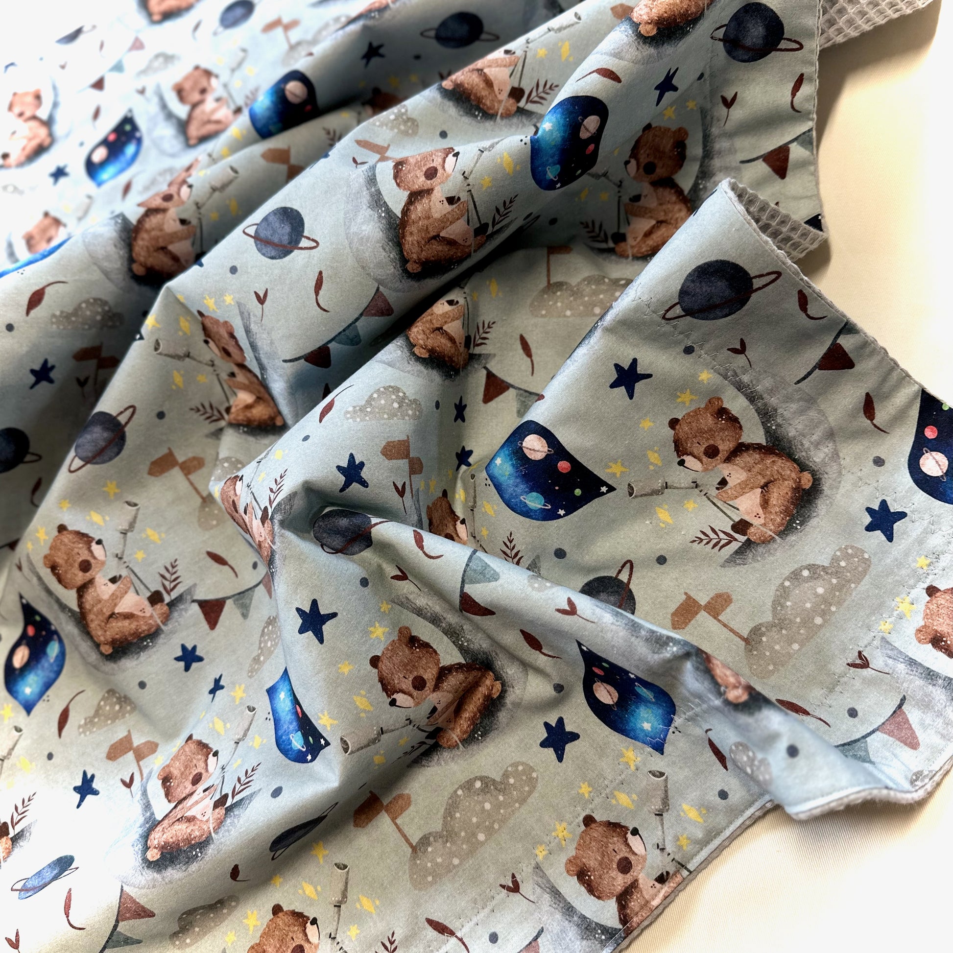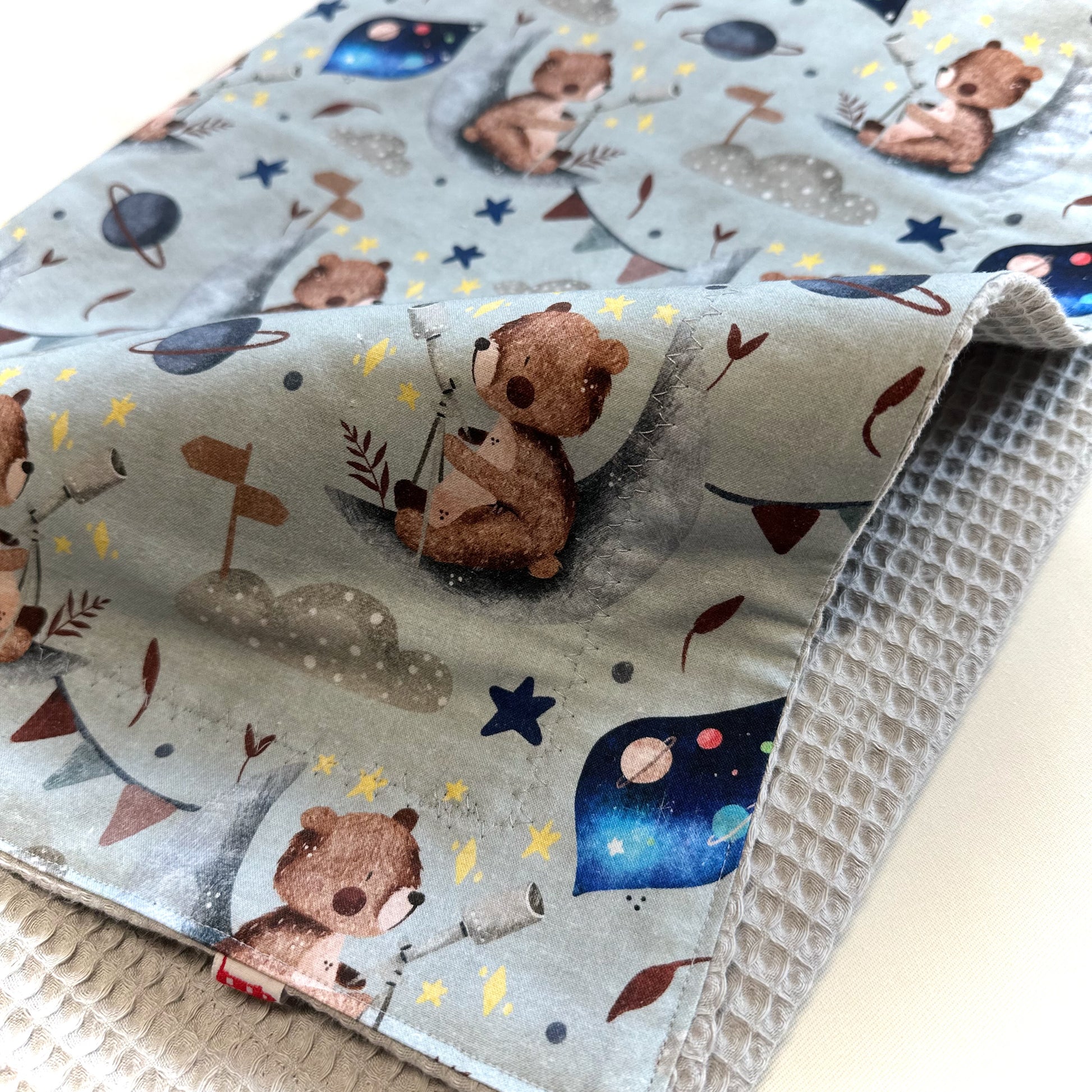 Diese Universaldecke aus Baumwolle mit dem zauberhaften Design in blaugrau ist sicher ein Highlight in der Grundausstattung und die perfekte Geschenkidee zur Geburt.