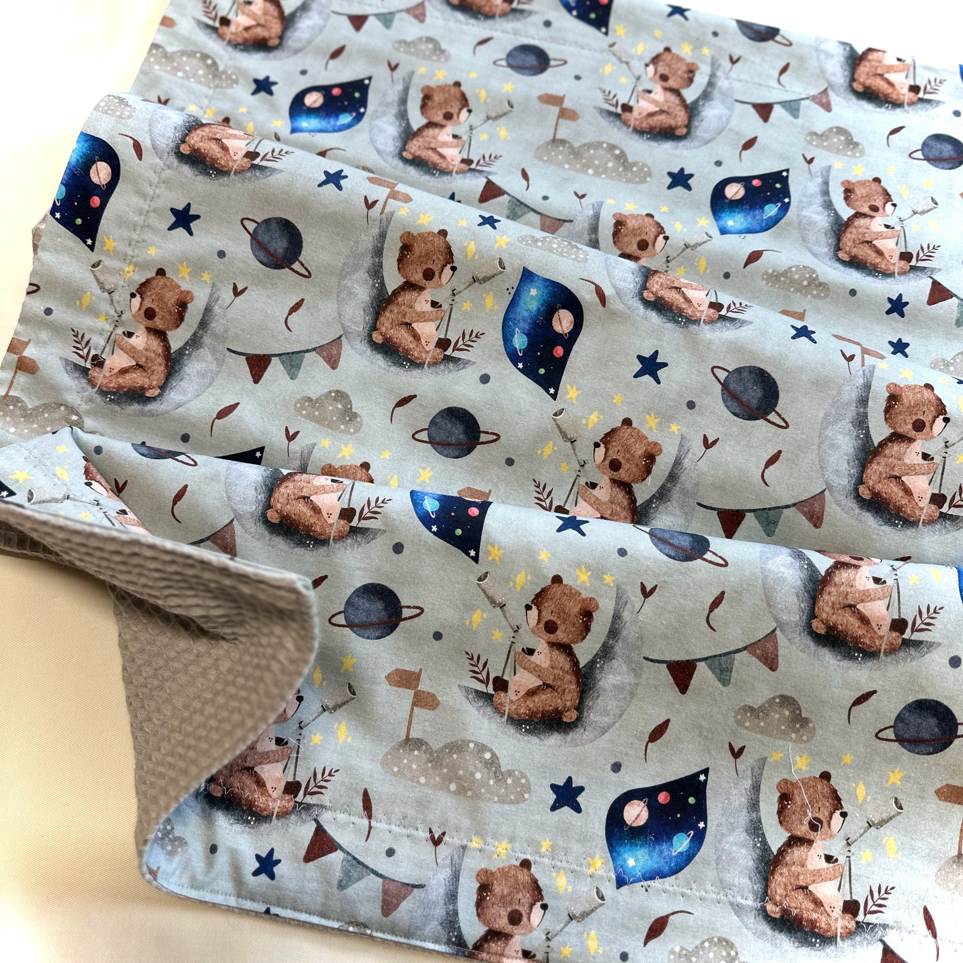 Sie hat eine Größe von ca. 65/90cm. Damit passt sie perfekt in das Babybettchen oder den Kinderwagen und kann auch als Wickelunterlage Verwendung finden.