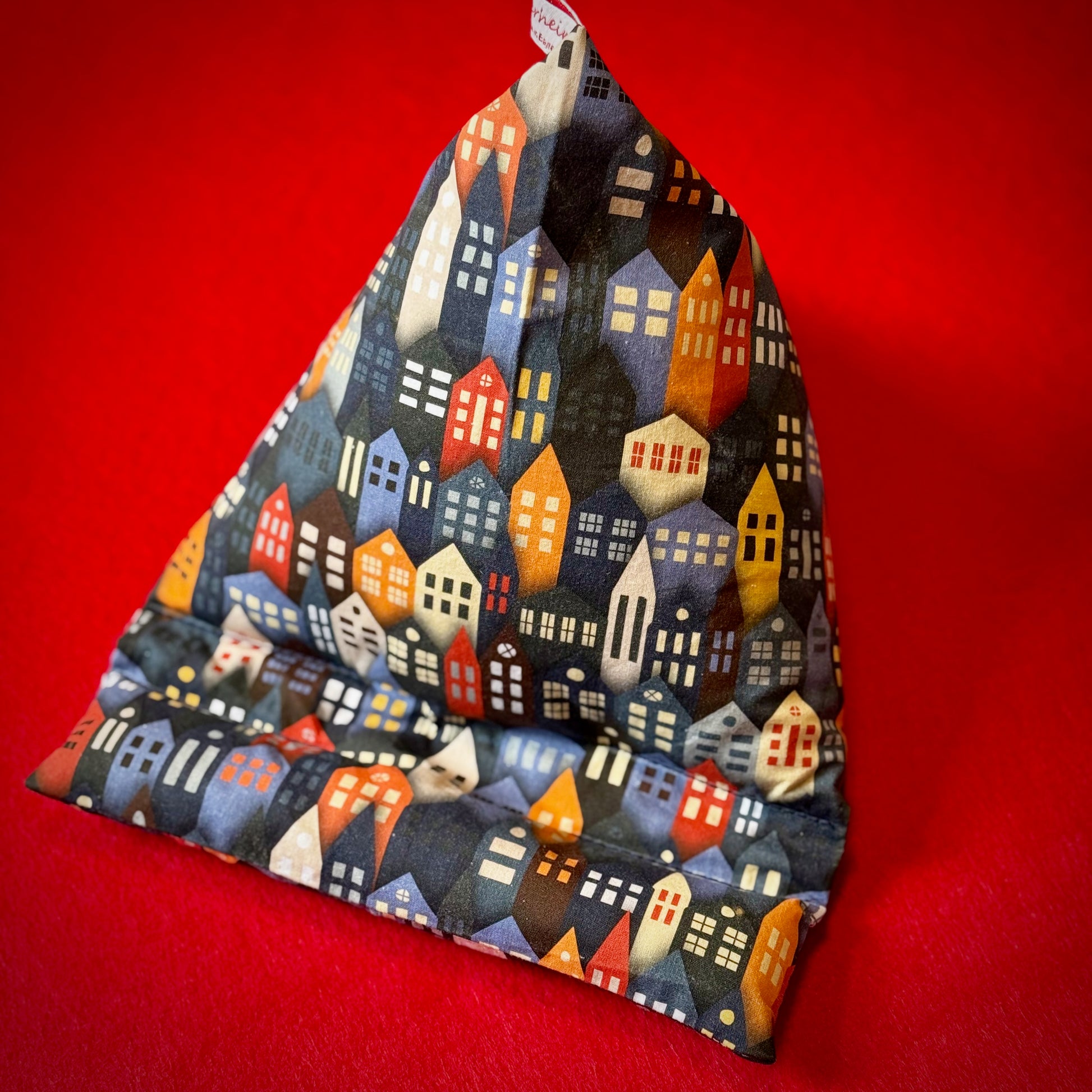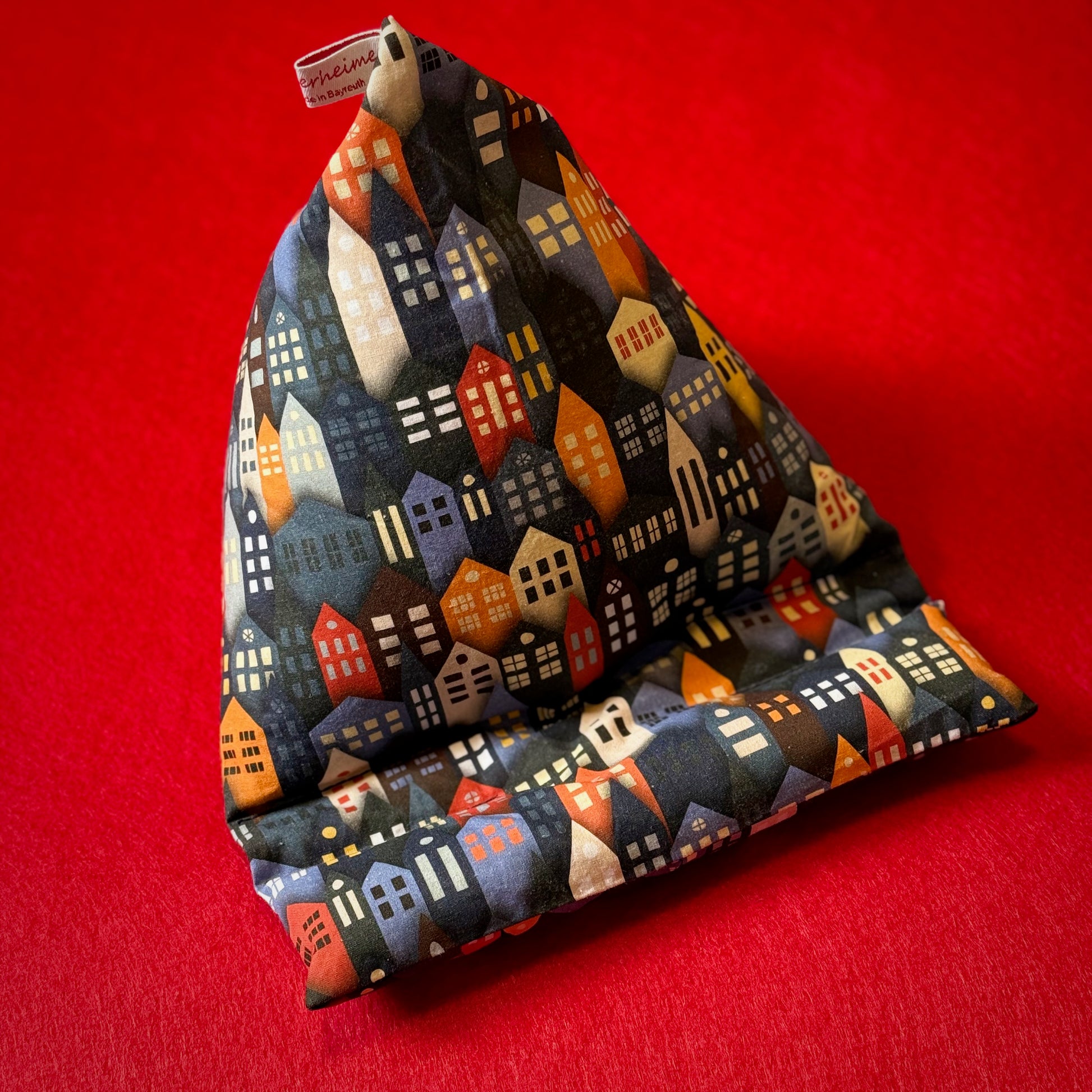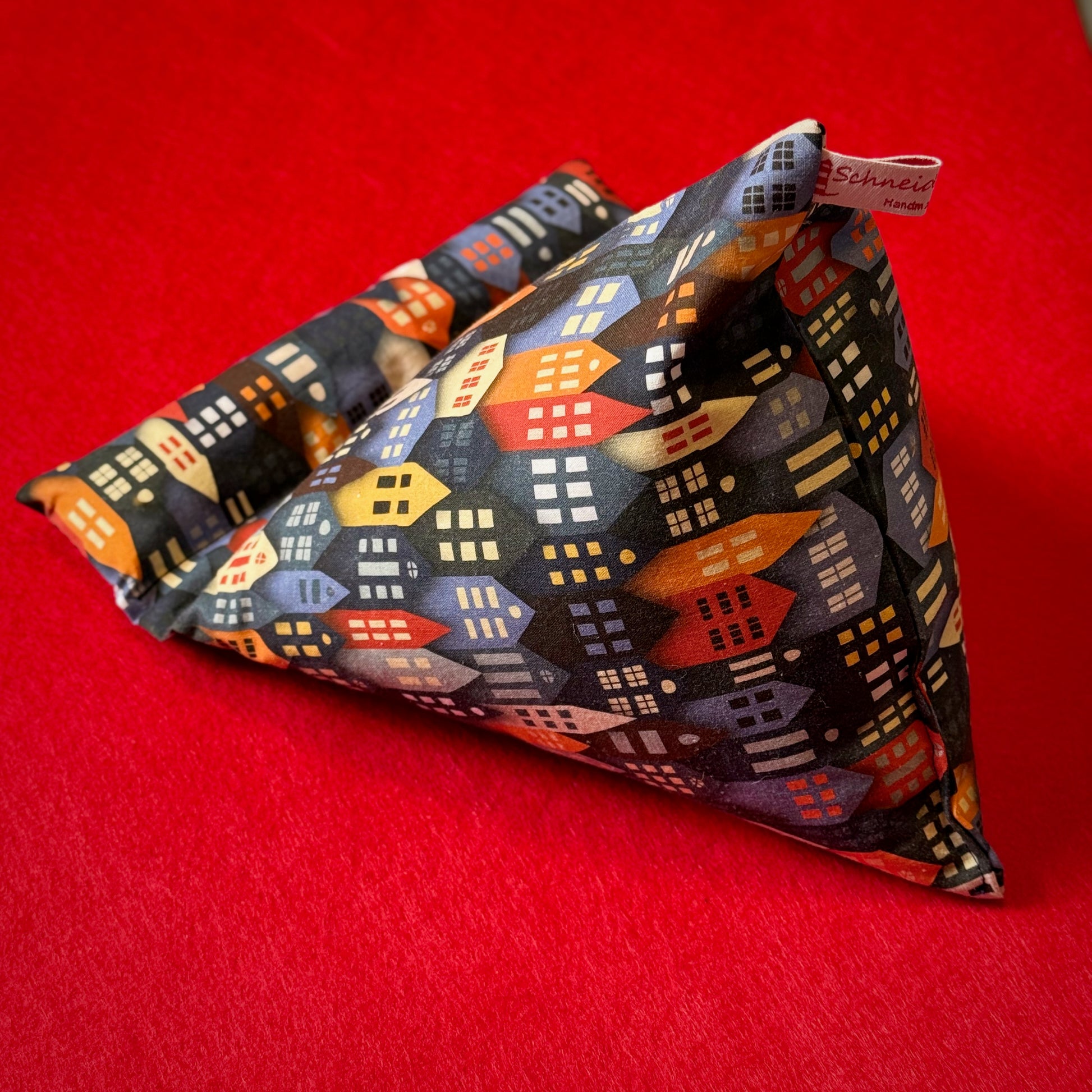 Als Naturfüllung für das Dreieckskissen verwenden wir anpassungsfähigem feinen Hirsespelz vom regionalen Lieferanten.