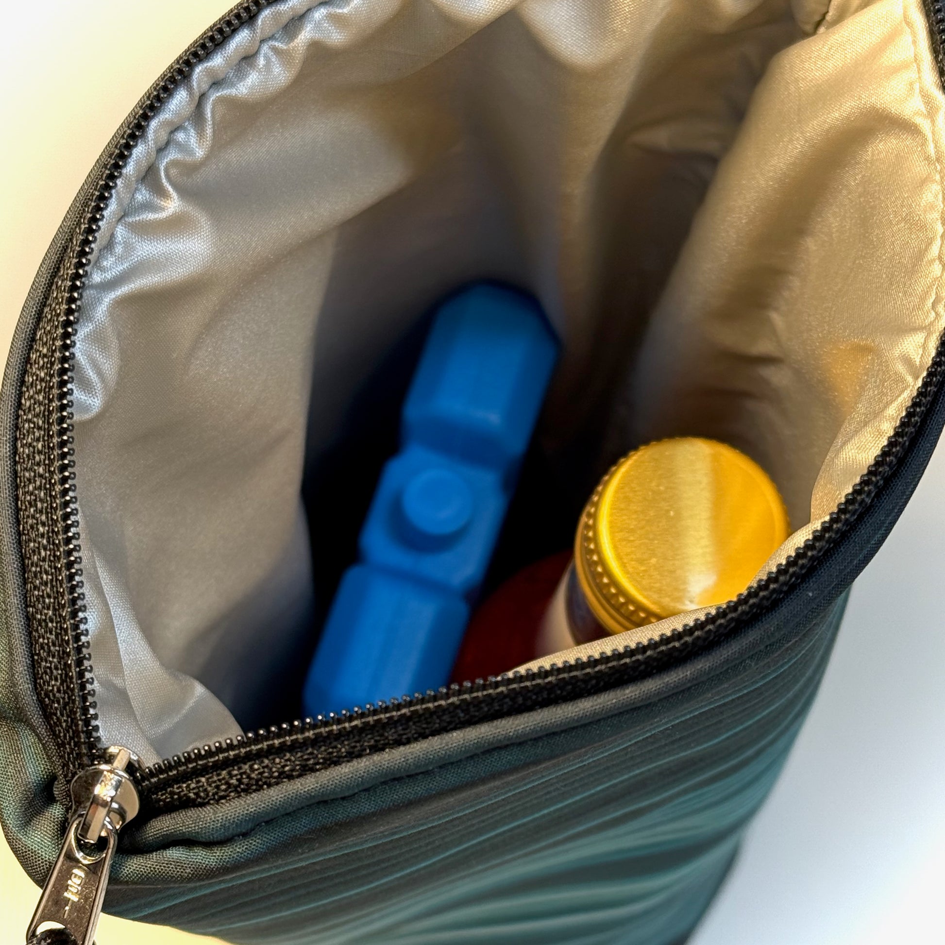 Die Thermo-Tasche für die Flasche sorgt für kühle Getränke, wenn die Temperaturen steigen.