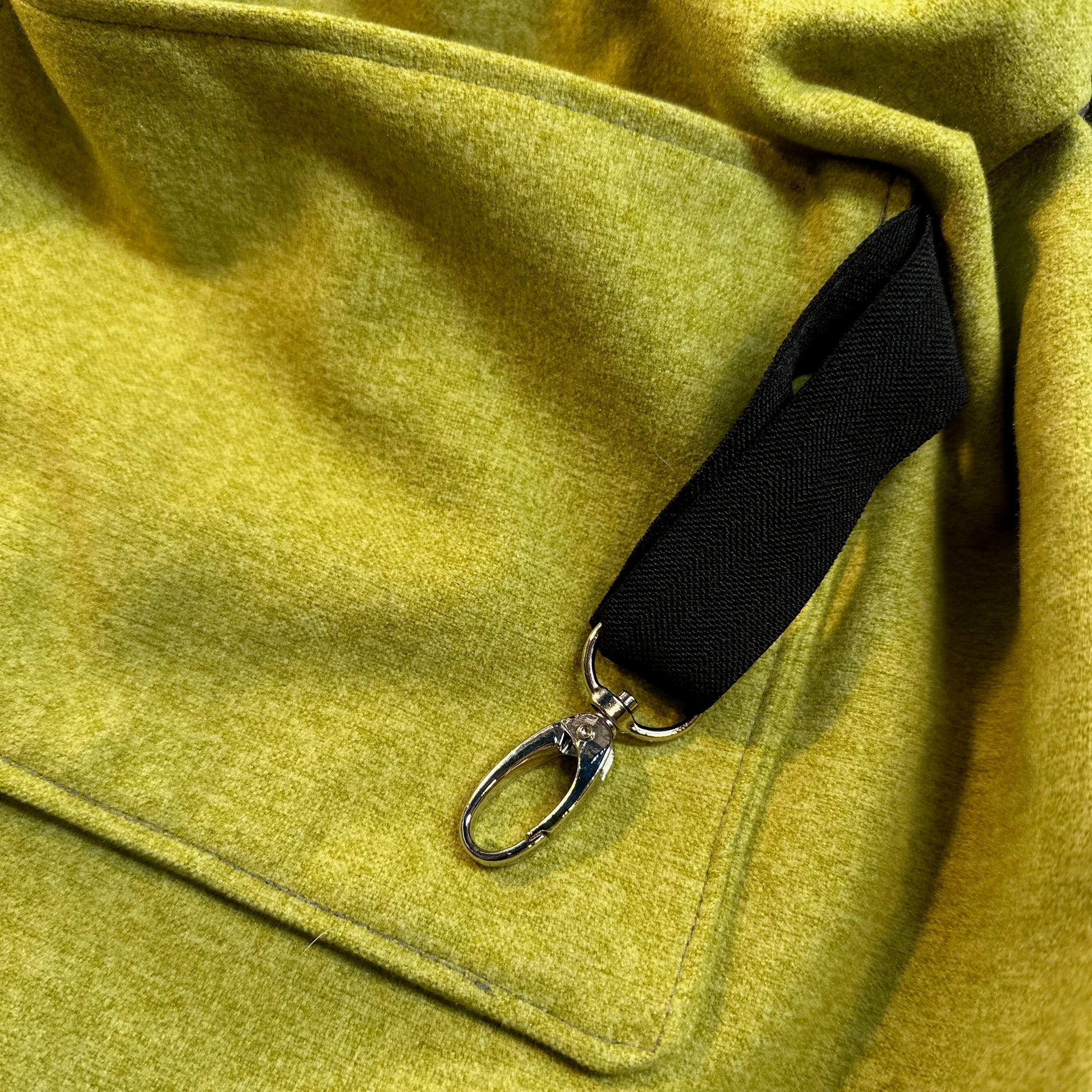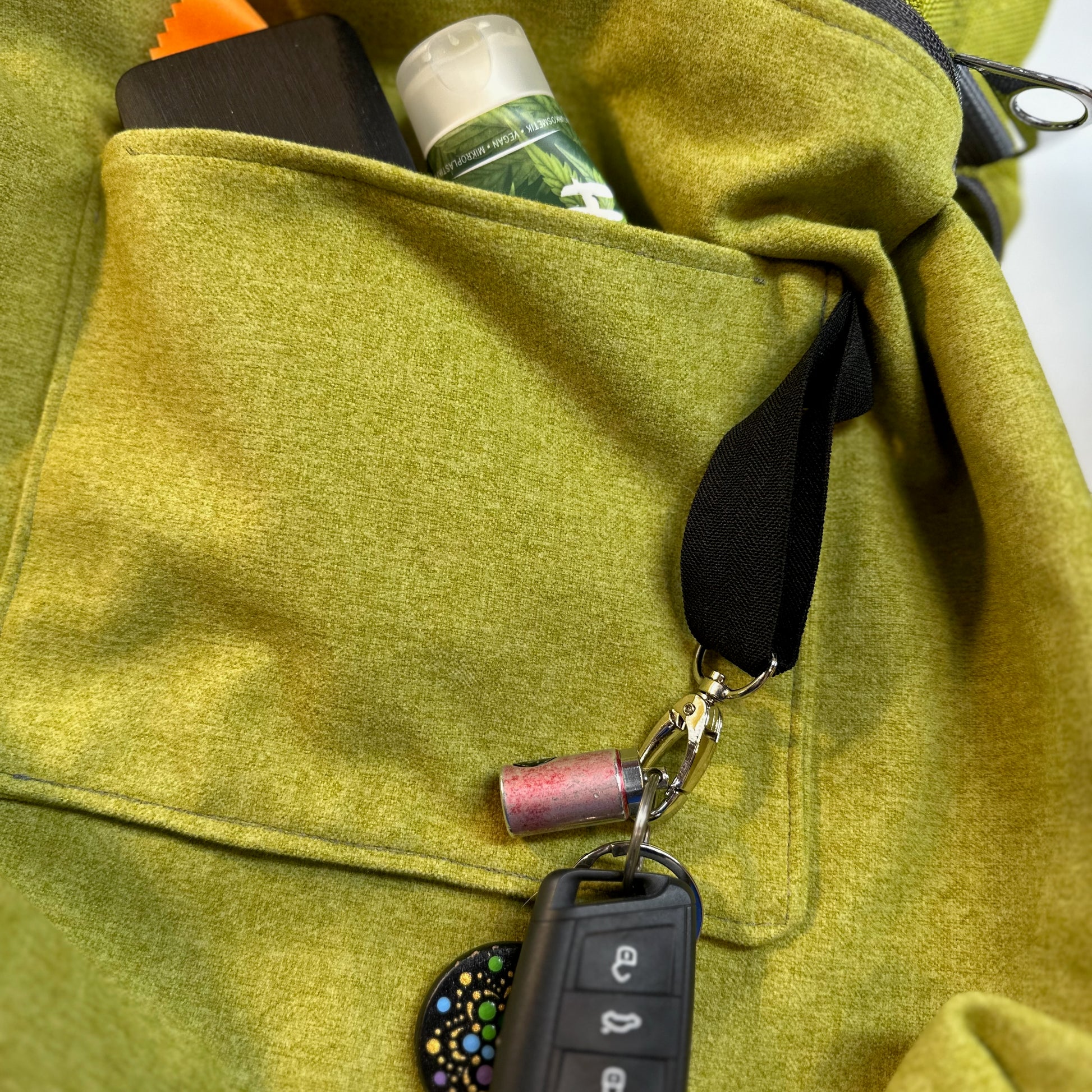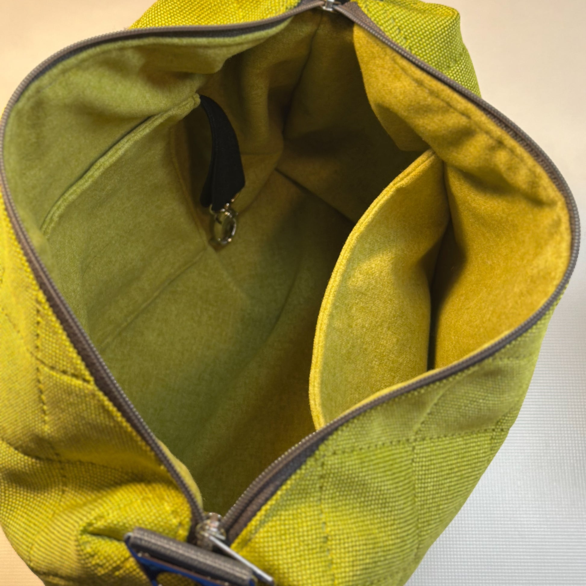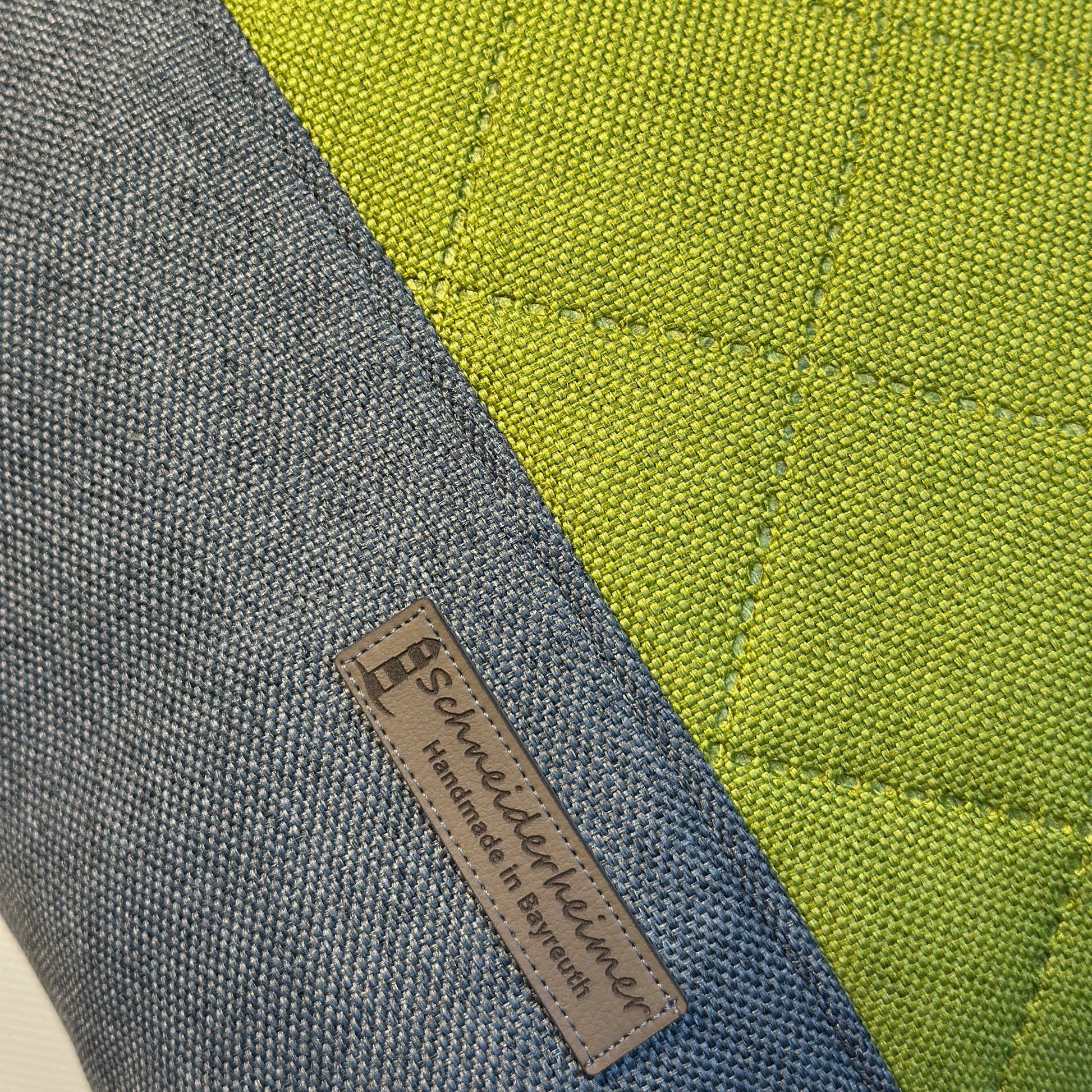 Apfelgrüner robuster Stepper, Deko-Canvas in Grau-melange und samtiges grünes Innenfutter, diese Materialien in Kombi kommen bei dieser Tasche zum Einsatz.