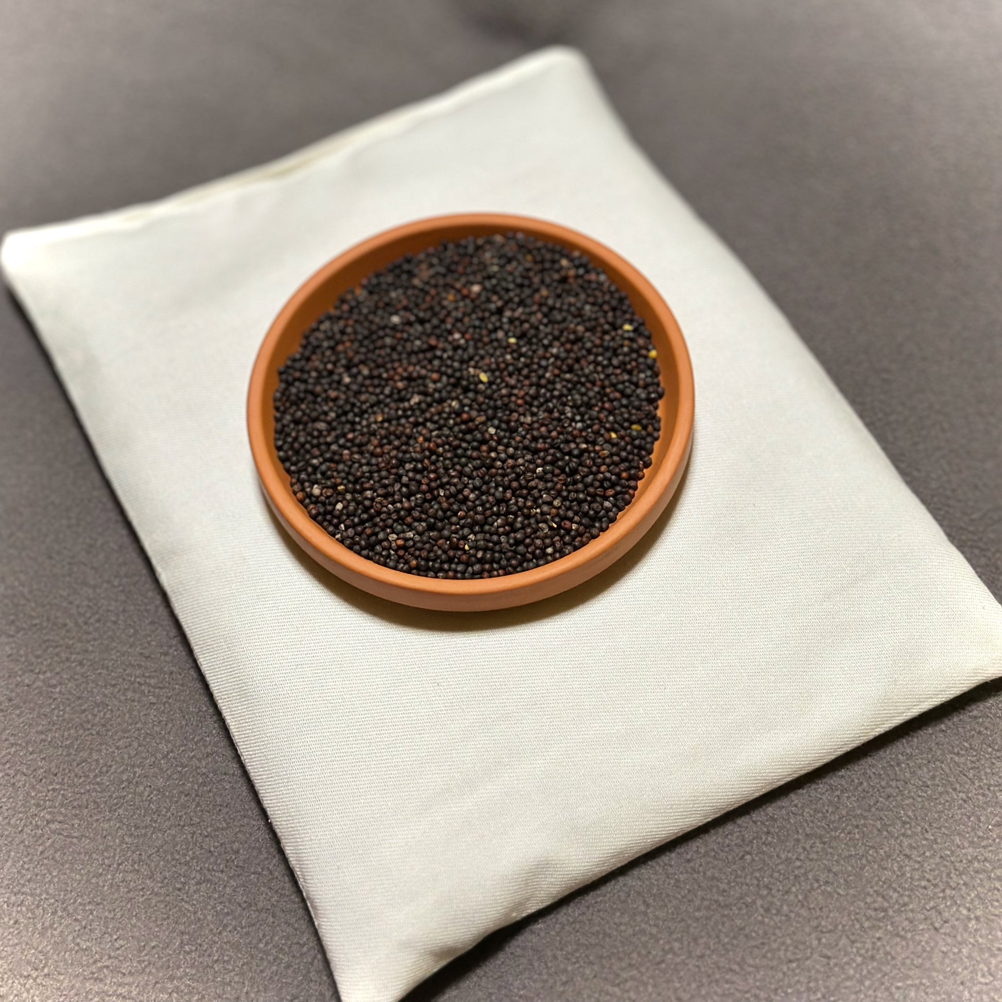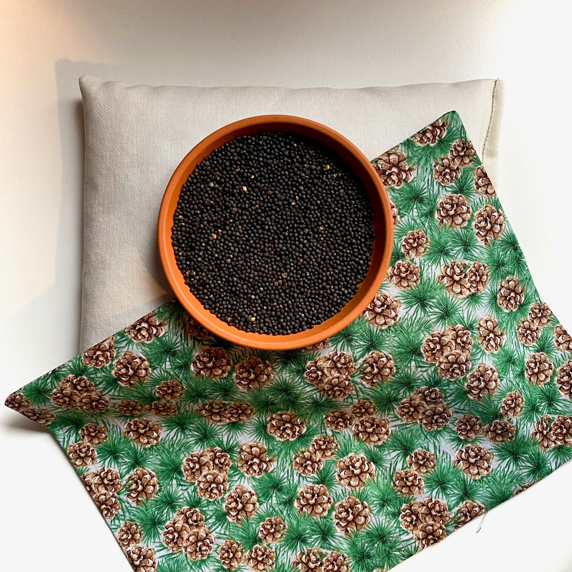 Das Kissen hat eine Größe von ca. 19/25cm und ist direkt befüllt. Der feinkörnige Rapssamen speichert durch seinen hohen Ölgehalt sowohl Wärme als auch Kälte gut.
