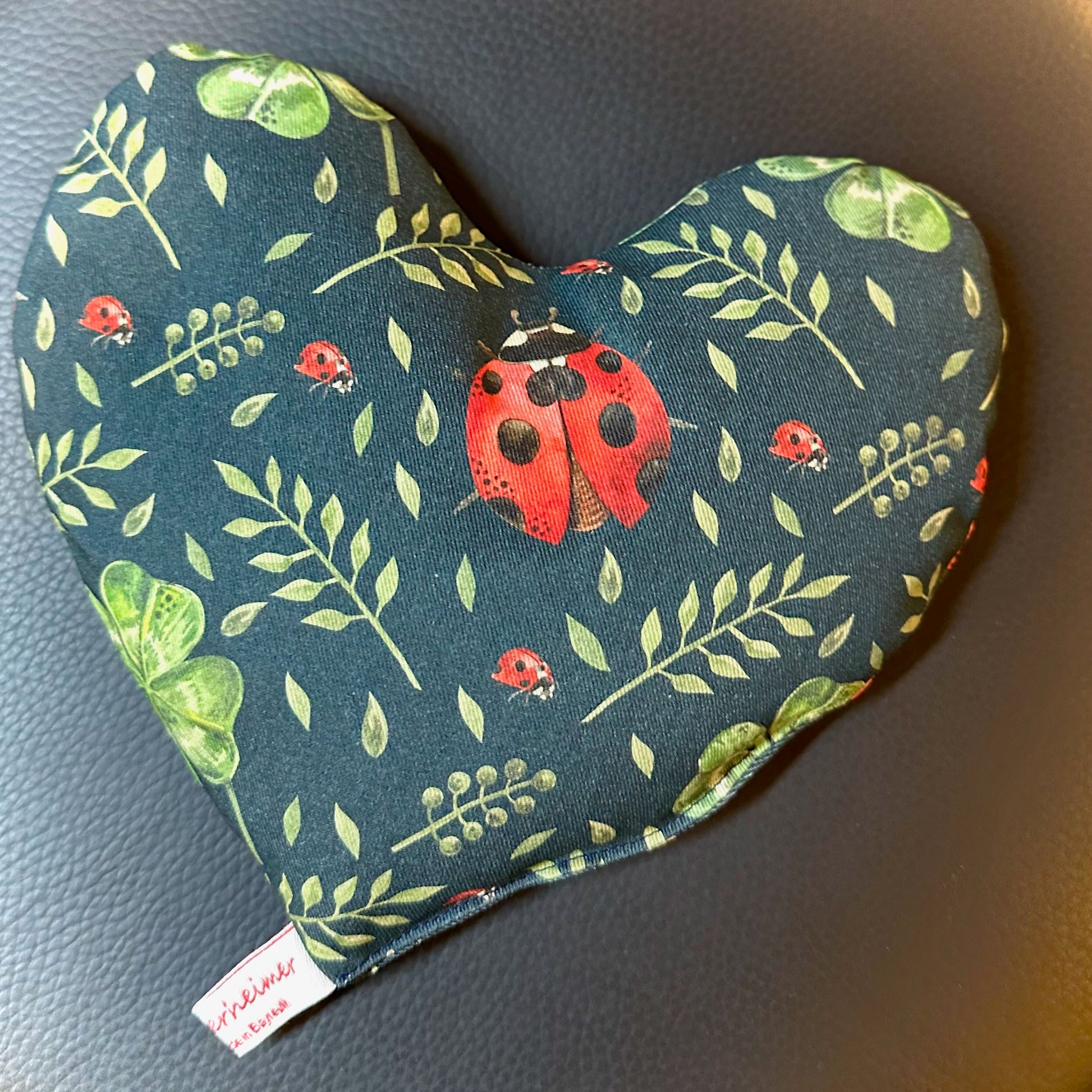 Das Herzkissen ist mit Leinsamen und Lavendelblüten befüllt und ca. 22cm groß.