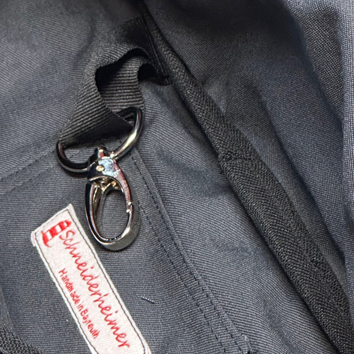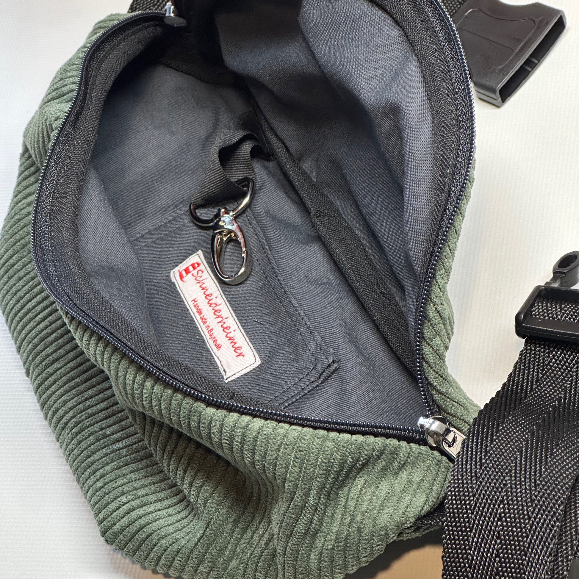 Im Inneren befinden sich ein Einsteckfach und ein Schlüsselkarabiner. Der längenverstellbare Tragegurt aus 4cm breitem Polyester-Gurtband hat einen praktischen Steckverschluss. Die Tasche kann Crossover oder um den Bauch getragen werden und hat kaum Eigengewicht.