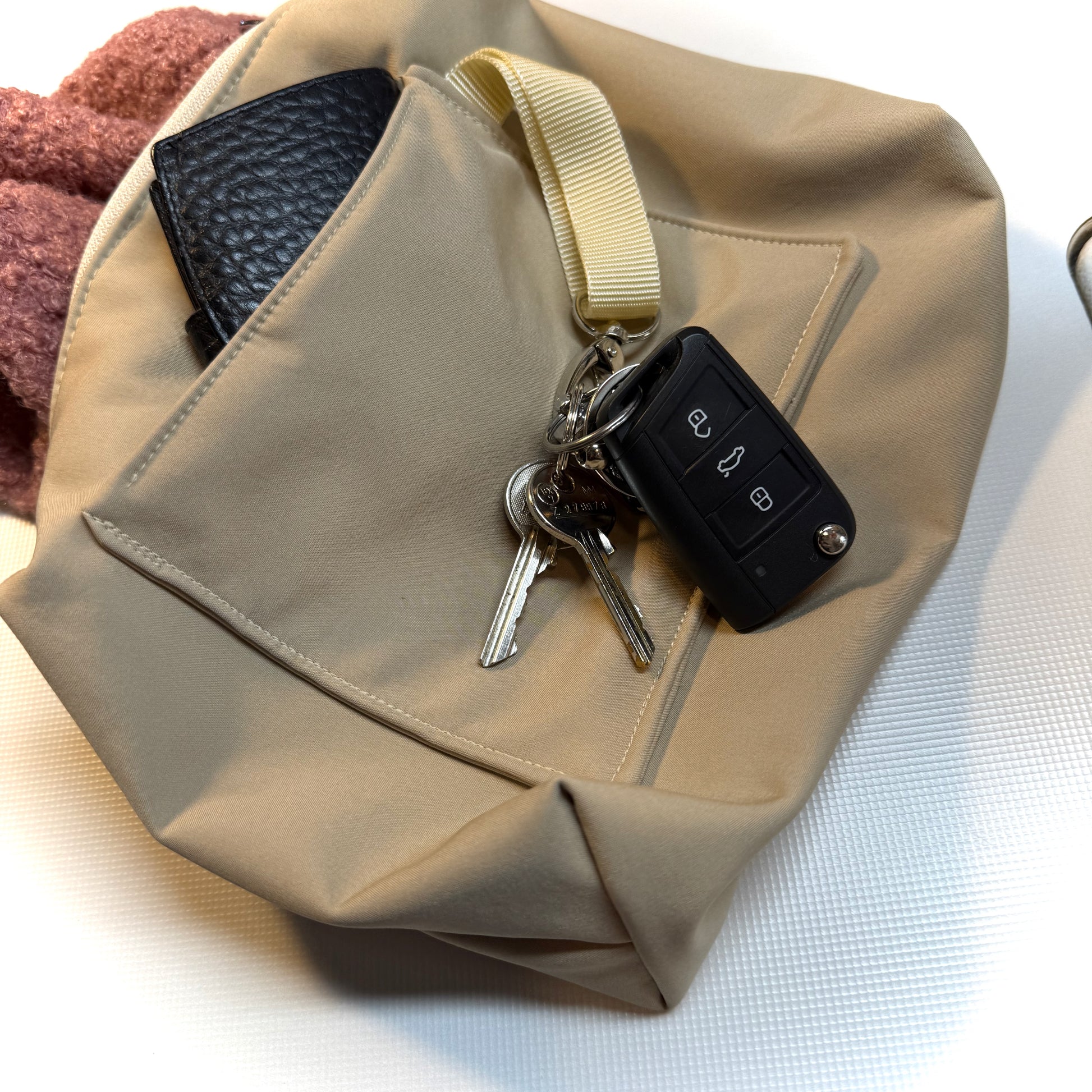 Ein Steckfach im Inneren und ein Schlüsselkarabiner gehören zur Ausstattung.