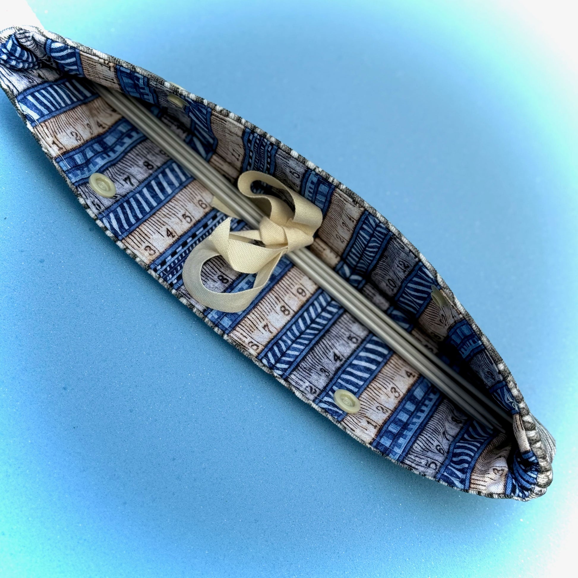 Diese "Nadelgarage" aus beigem Canvas mit Strickmotiv und Innenfutter aus Patchwork-Baumwollstoff ist ein versandbereites Einzelstück.