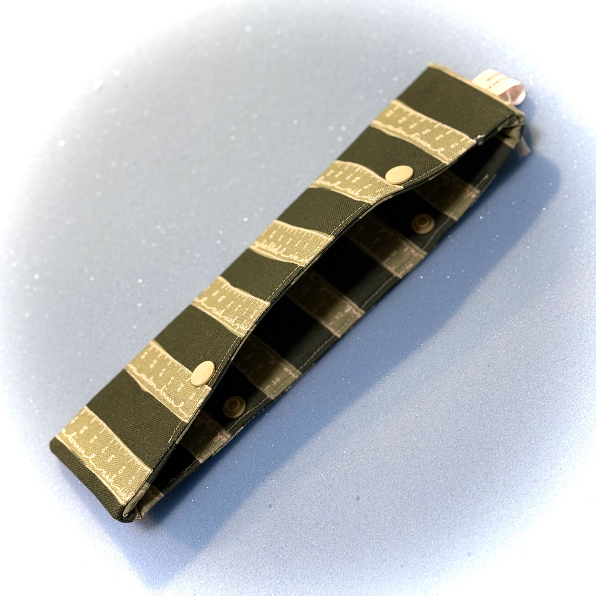 Diese "Nadelgarage" aus Bio-Baumwoll-Canvas in Grün und Innenfutter aus Baumwolle im gleichen Muster ist ein versandbereites Einzelstück.