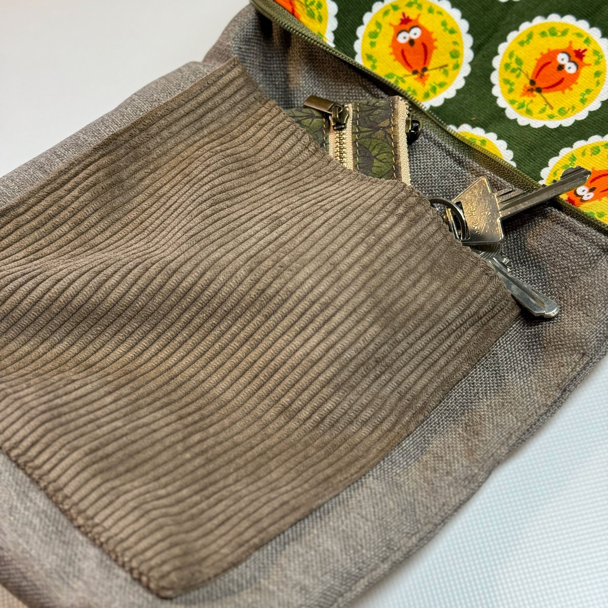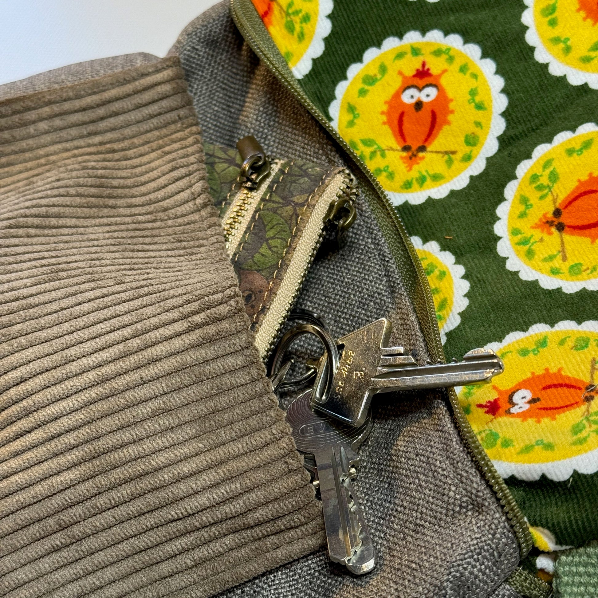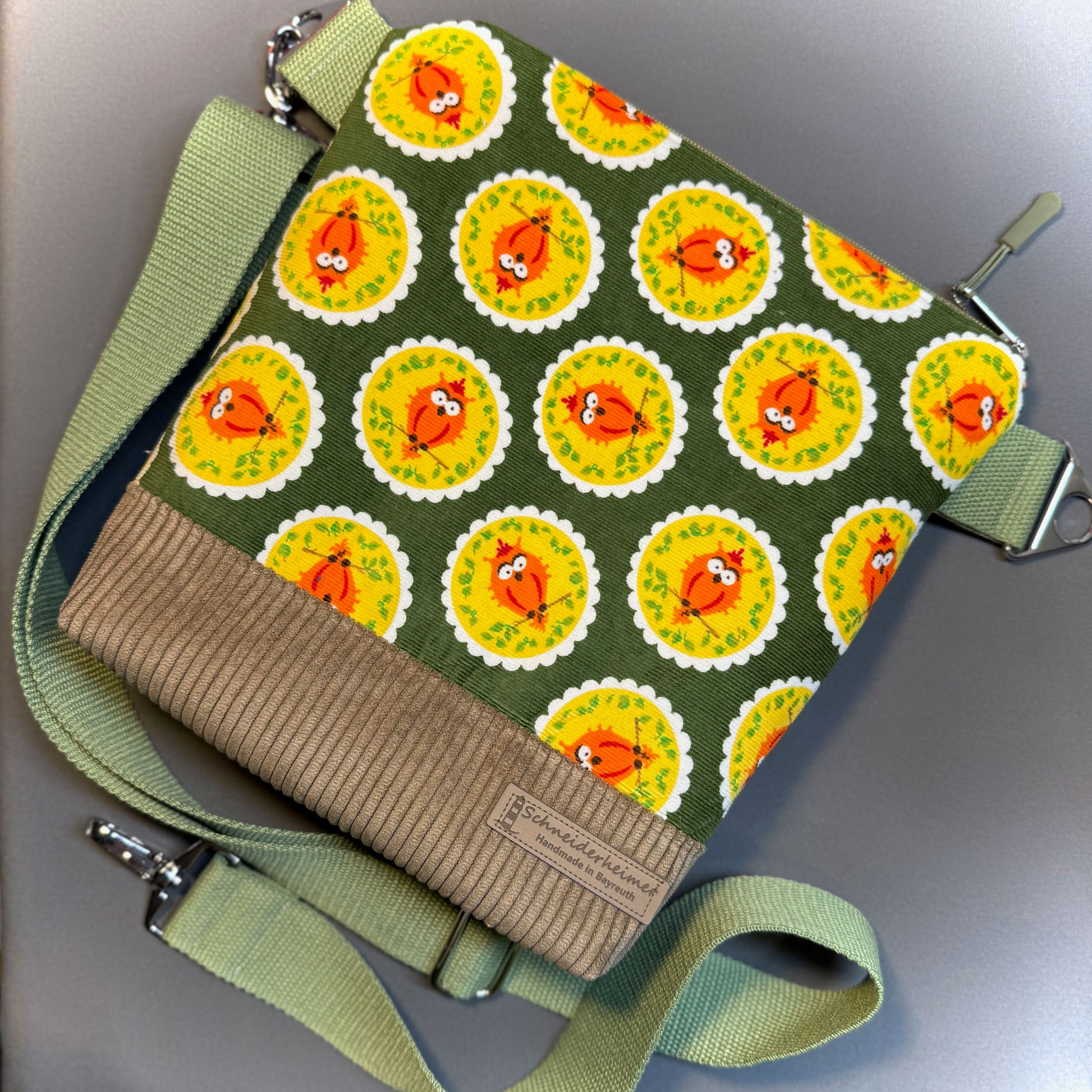 "Petra" im Quadratformat - Einzelstück Cord mit Fröhlichen Eulen