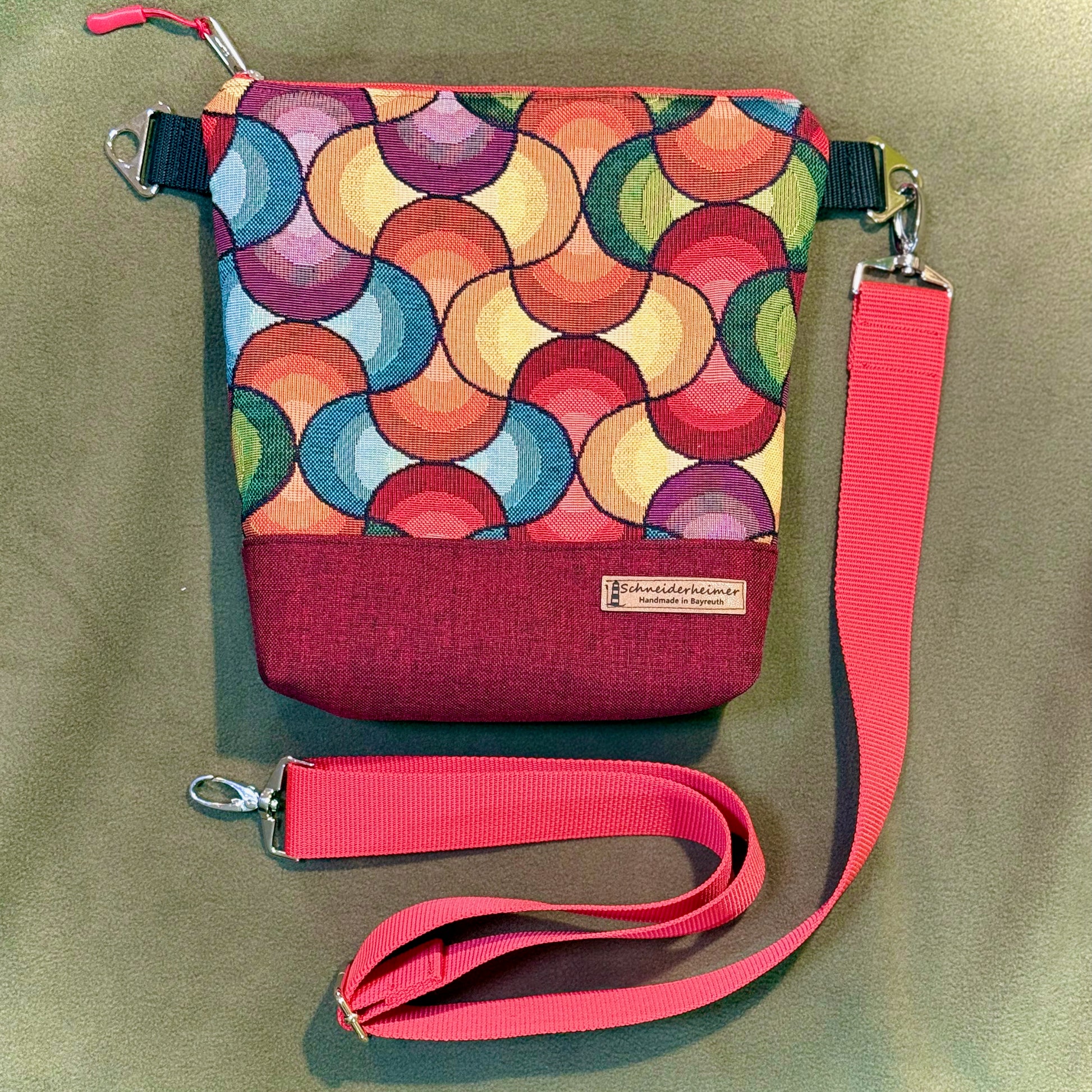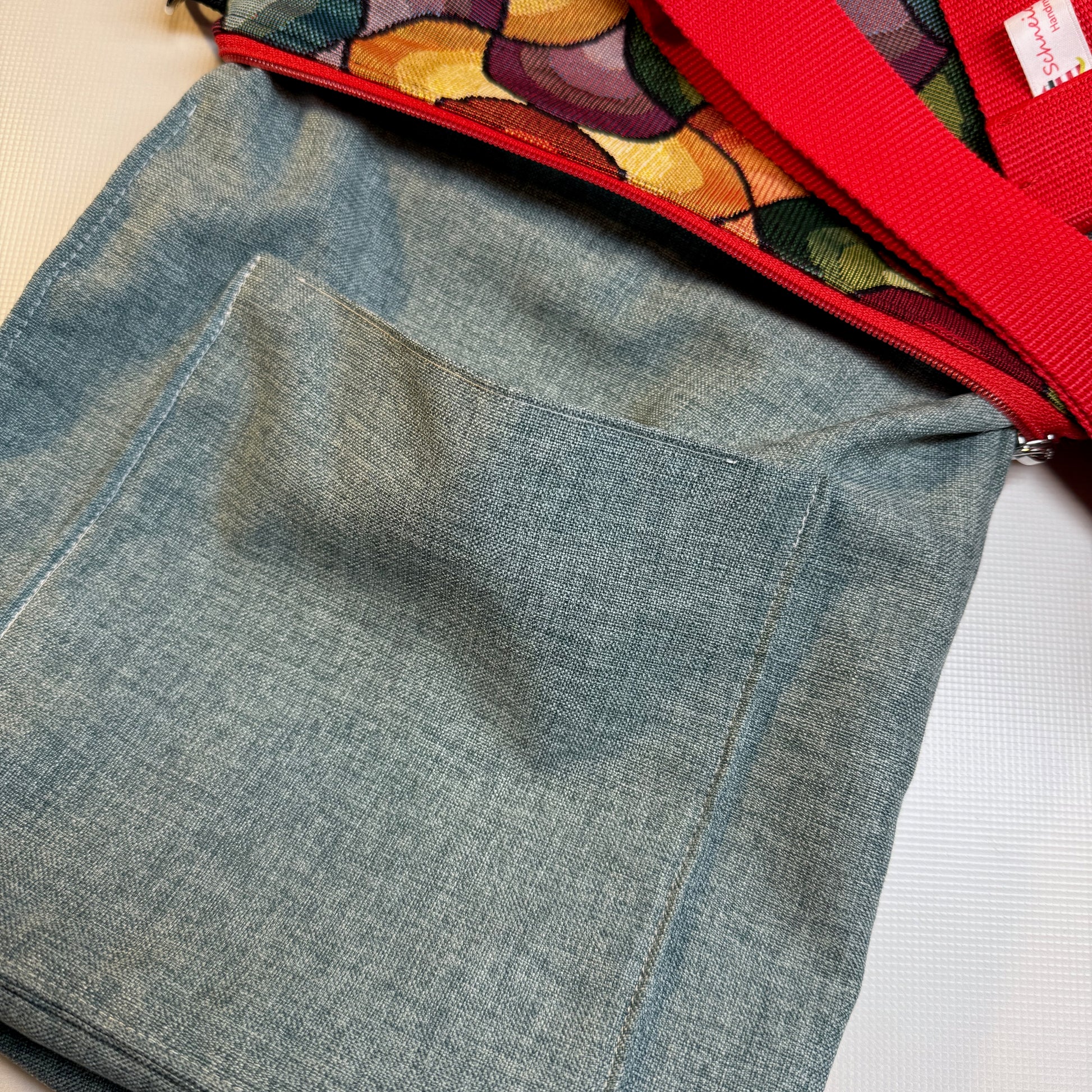 Gefertigt haben wir die Tasche aus strapazierfähigem wasserabweisendem Dekostoff auf der Unterseite und gemustertem langlebigem Gobelin. Für das Innenfutter haben wir robusten Dekocanvas in Beige verwendet. Für den schnellen Zugriff sorgt ein Steckfach. Das hochwertige Gurtband aus einer Manufaktur im Bergischen Land ist längenverstellbar und bequem zu wechseln.