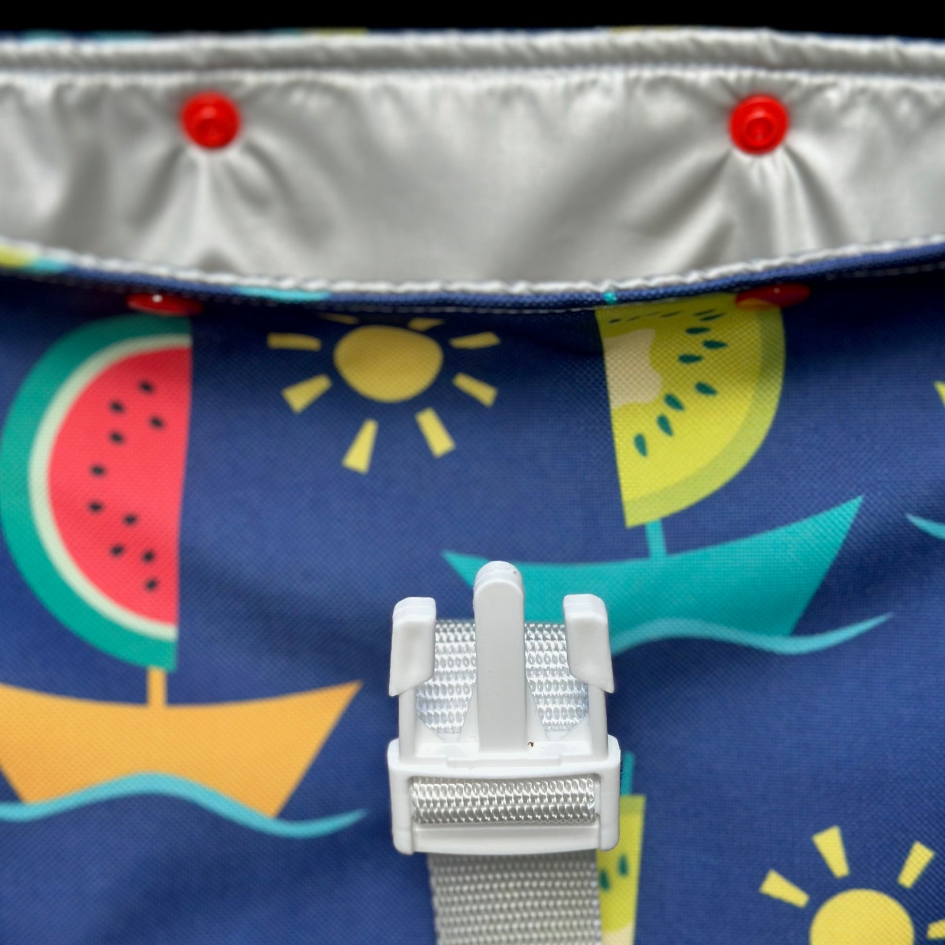 Größenmässig angepasst haben wir den "Thermo-Theo" an die Standardgröße gängiger Brotzeitdosen für Kinder. Mit dem längenverstellbaren Gurt kann der Verschluss individuell an die Füllmenge angepasst werden. Der praktische Steckverschluss ist leicht zu bedienen.