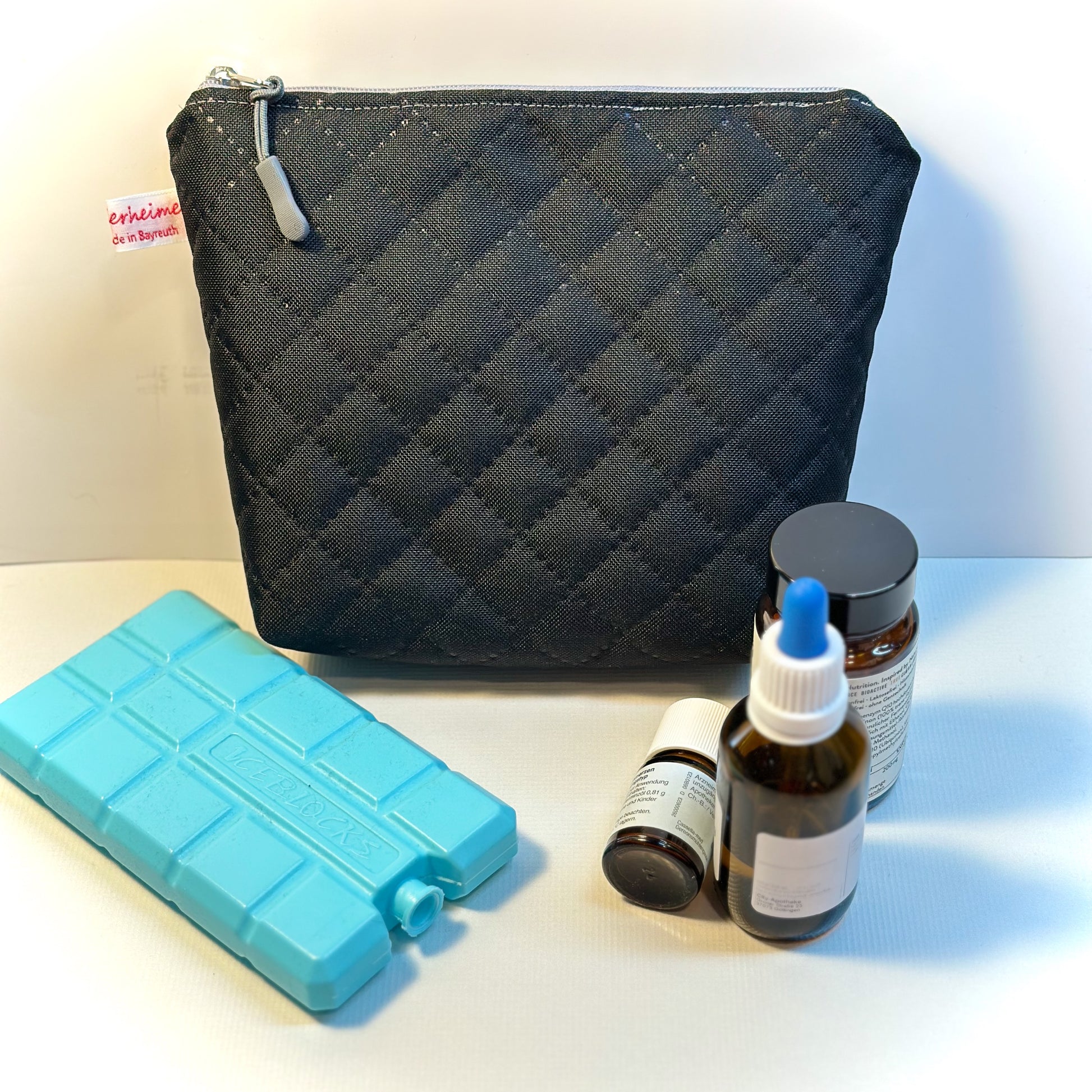 Unser Thermo-Täschchen in dreilagiger Ausstattung isoliert auch in der warmen Jahreszeit und auf Reisen Ihre Medikamente, Süssigkeiten, Kosmetik und mehr zuverlässig. Auch ein Kühlpad findet zusätzlich darin Platz.