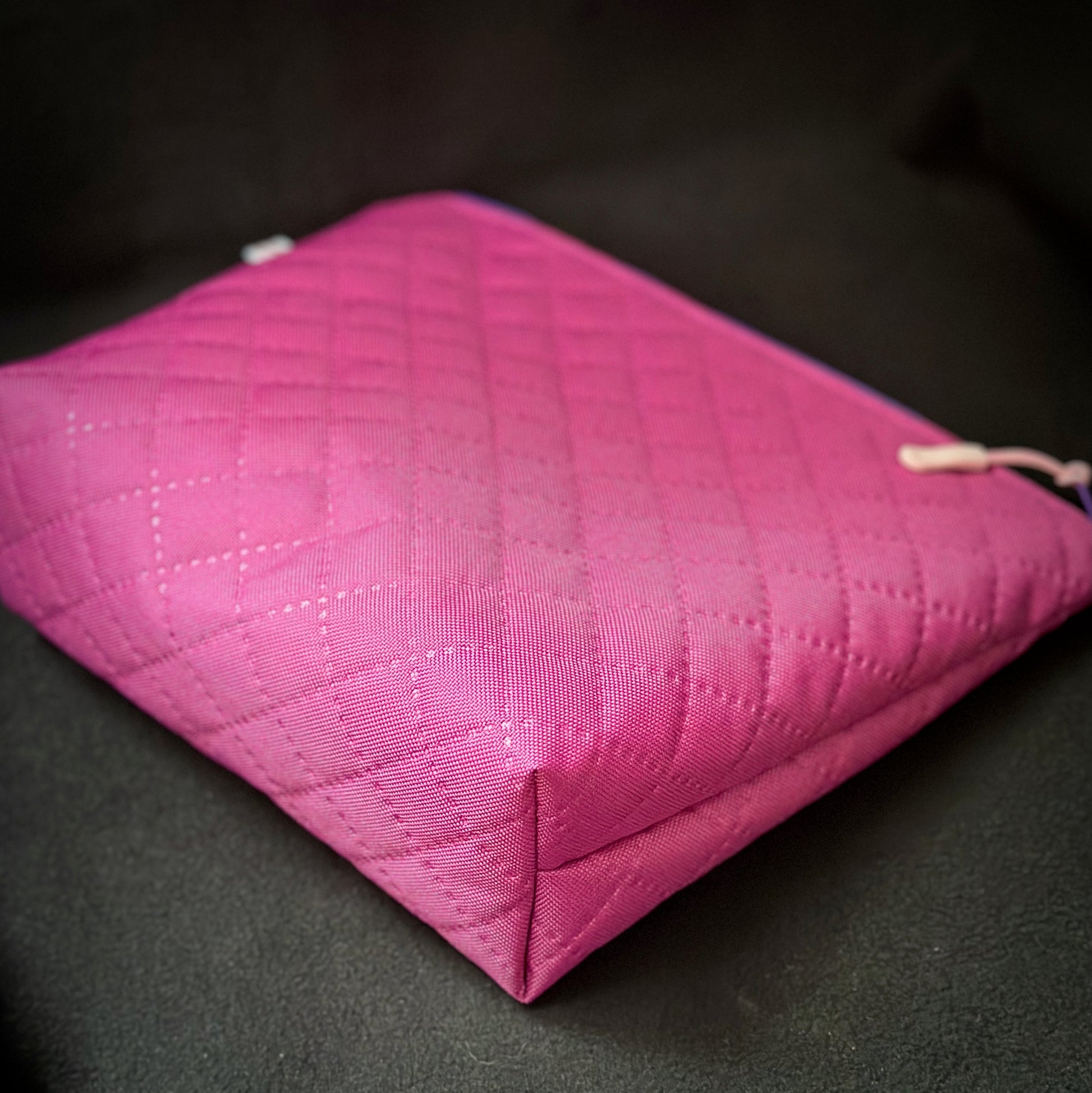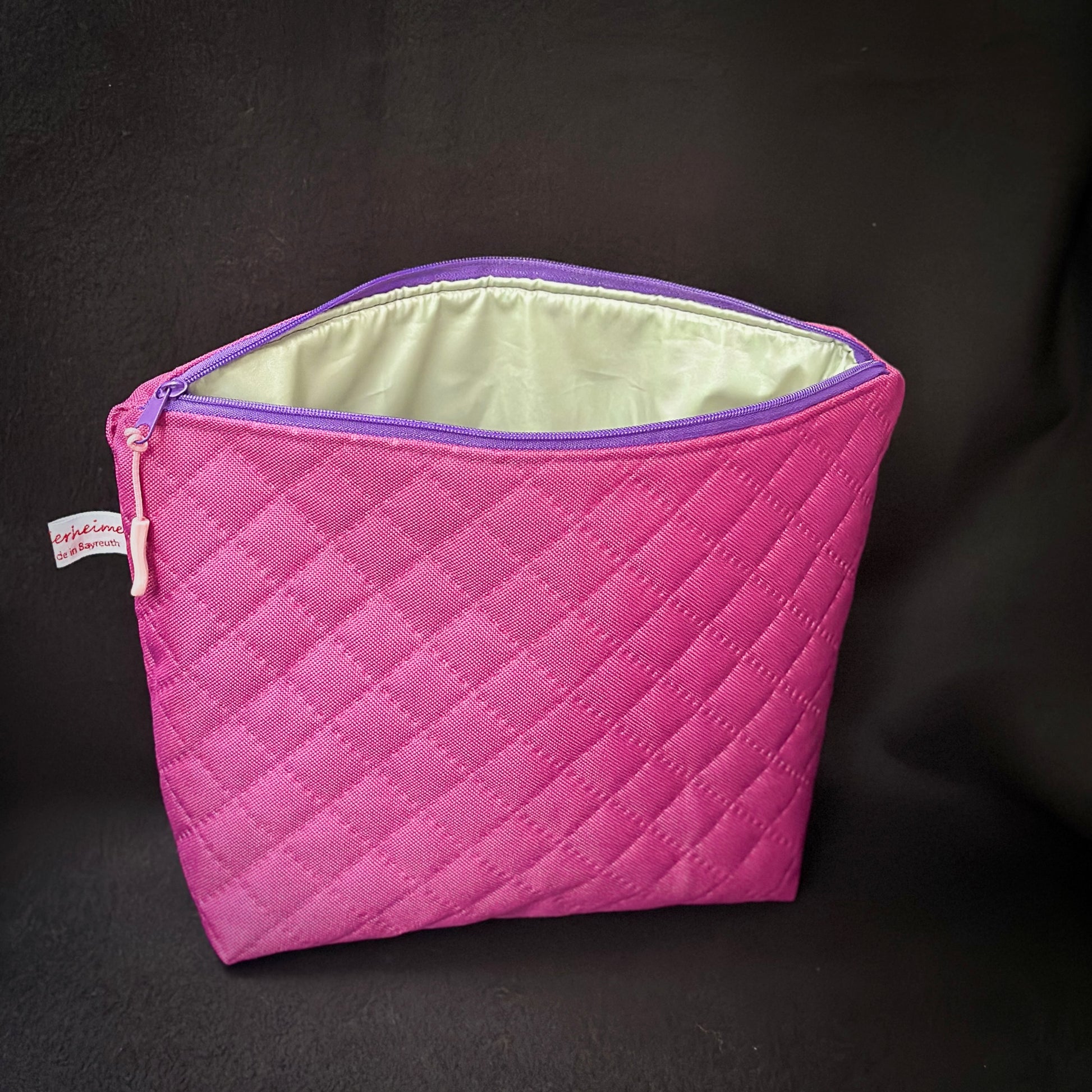 Material: Steppstoff 100% Polyester (wasserabweisend und abwaschbar), Thermolam, Silberstoff, Reißverschluss violett