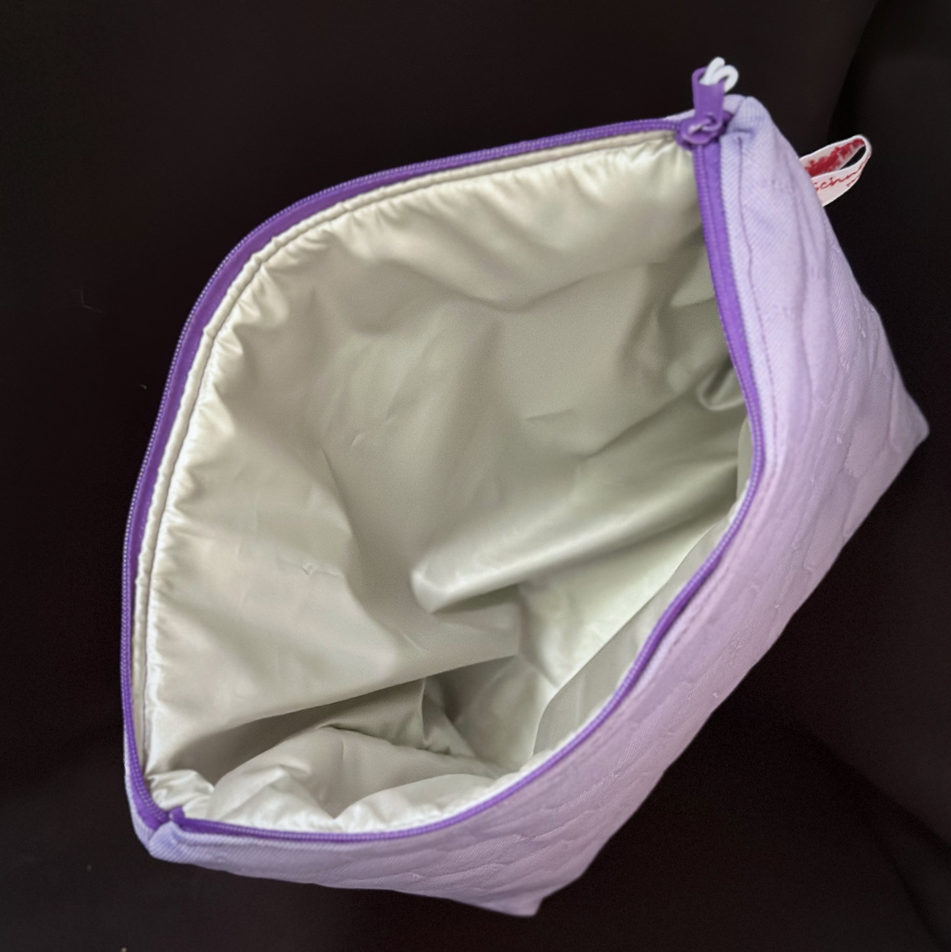 Material: Steppstoff 100% Polyester (wasserabweisend und abwaschbar), Thermolam, Silberstoff, Reißverschluss violett