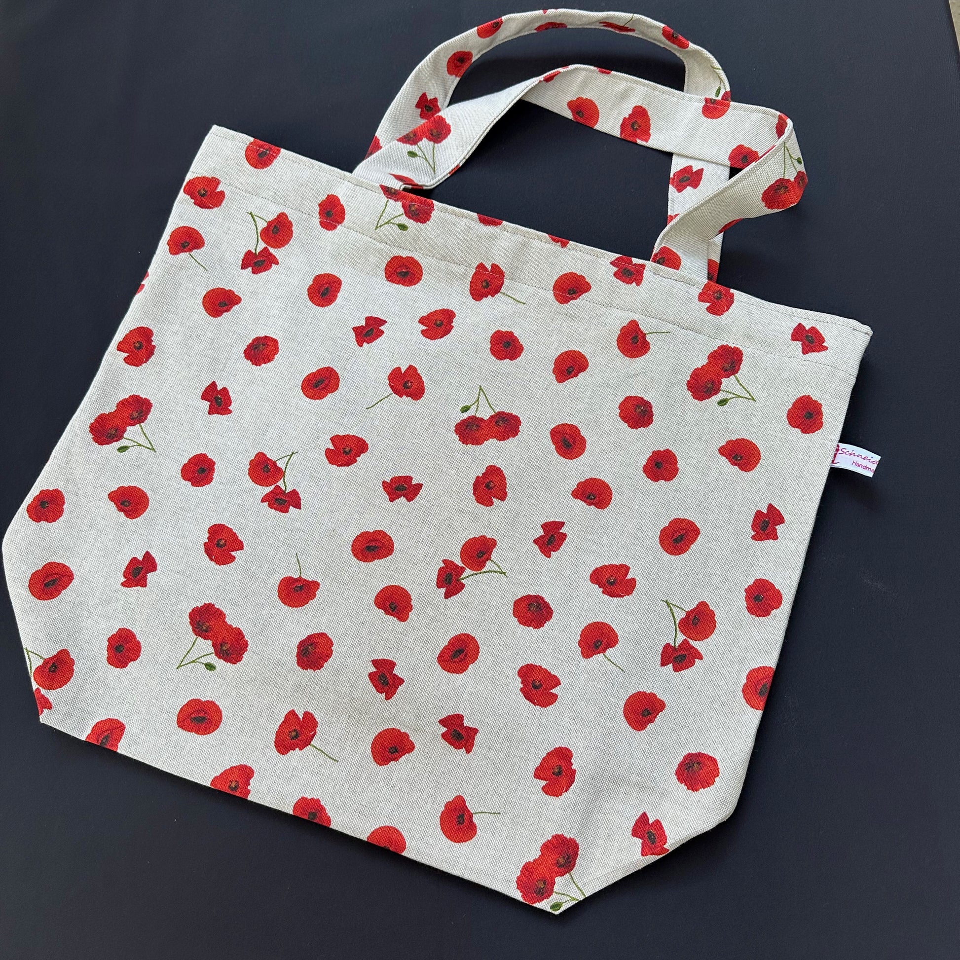 Die Tasche hat eine Höhe von ca. 31cm und ist ca. 44cm breit. Der abgenähte Boden gibt ihr eine Tiefe von 15cm. Die Henkel sind ca. 50cm lang, für bequemes Tragen in der Hand. Durch die verdeckten Nähte im Inneren franst der Stoff auch beim Waschen nicht aus.