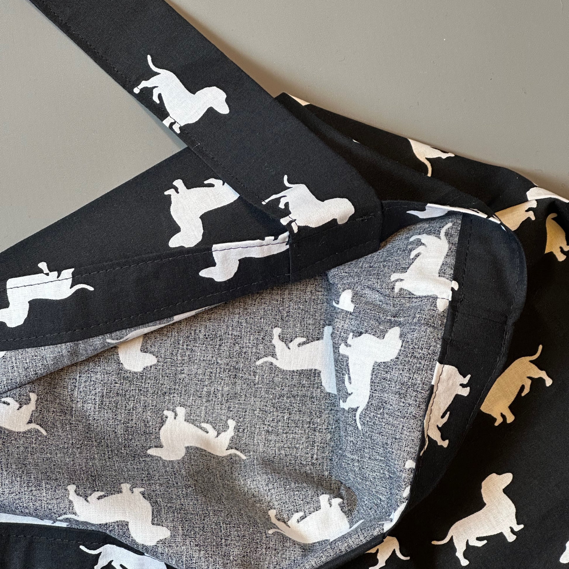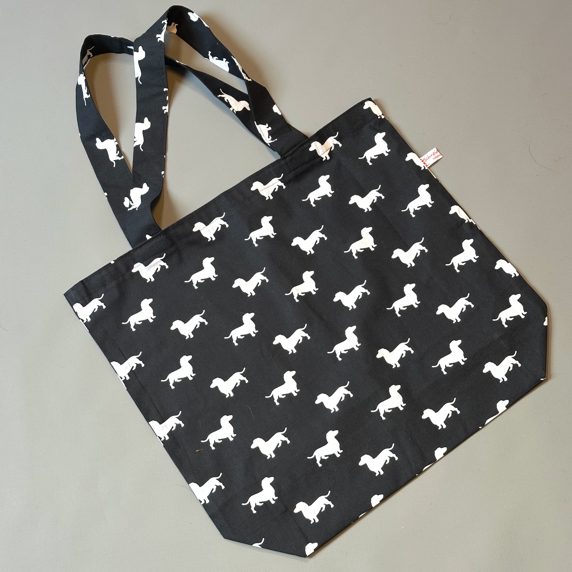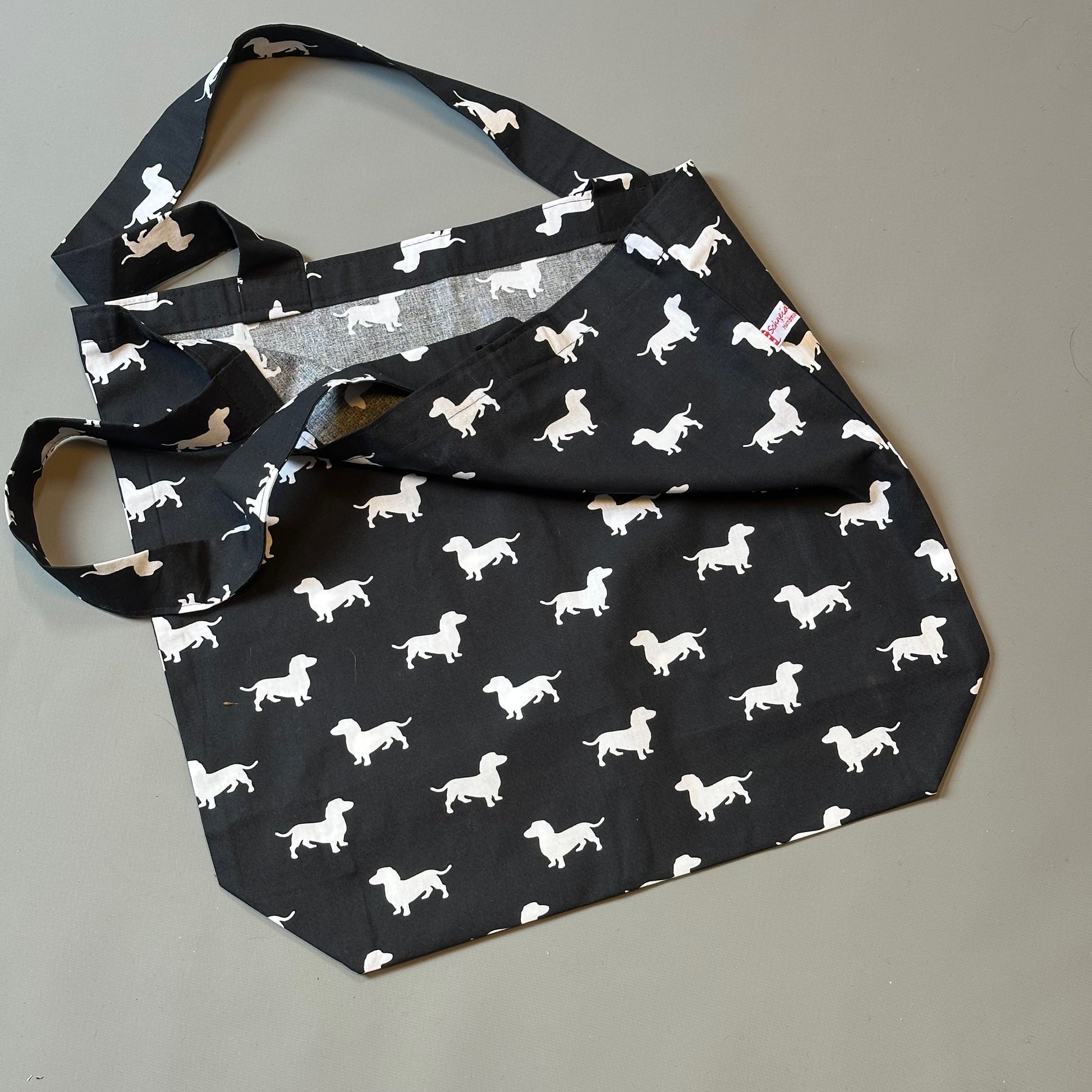 Die Tasche hat eine Höhe von ca. 34cm und ist ca. 45cm breit. Der abgenähte Boden gibt ihr eine Tiefe von 12cm. Die Henkel sind ca. 60cm lang.