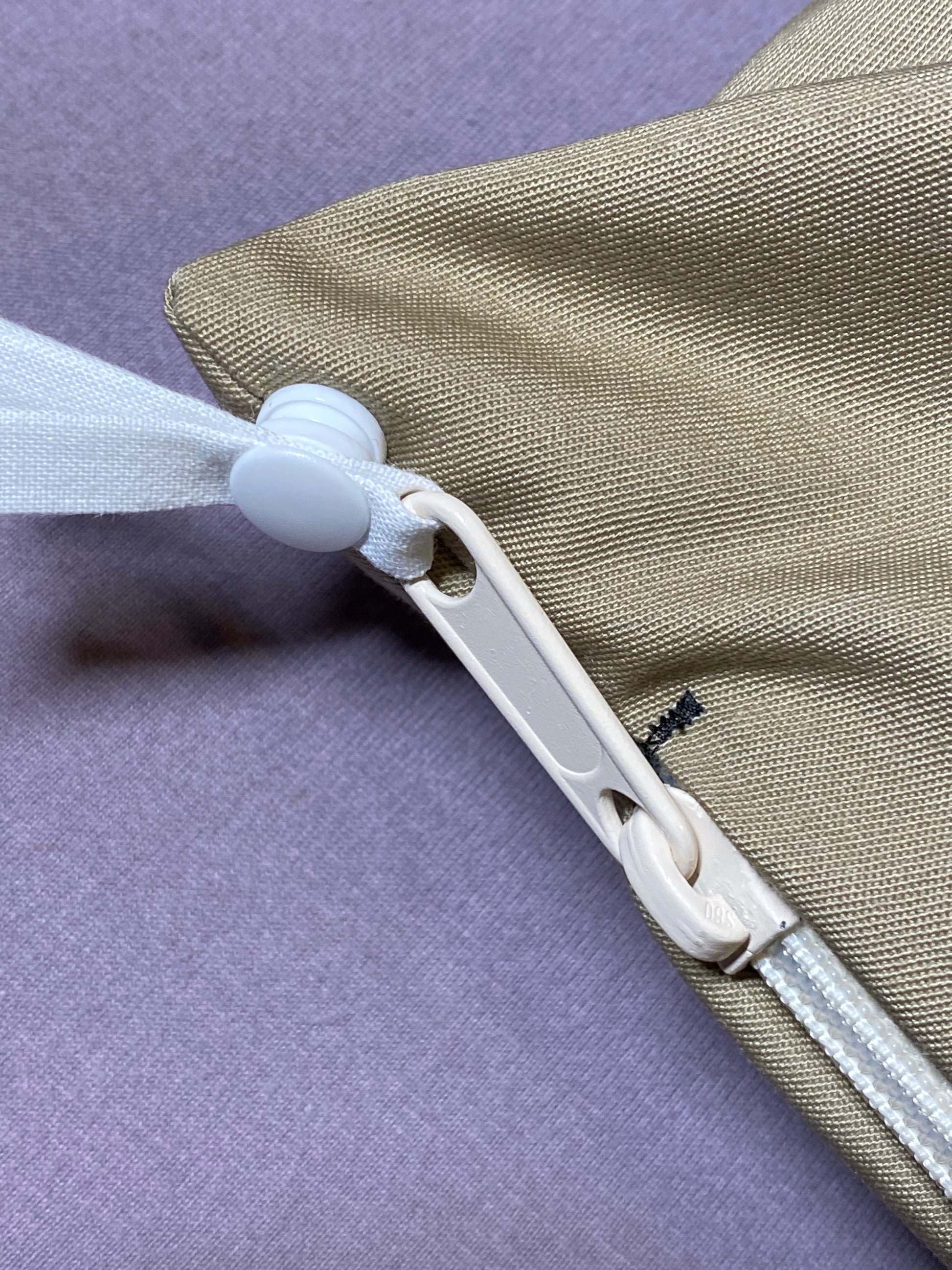 Sowohl Kissen als auch Bezug sind mit einem Reißverschluss über die gesamte kurze Seite ausgestattet. Ein Druckknopf sichert den Reißverschluss am Kissen zusätzlich.