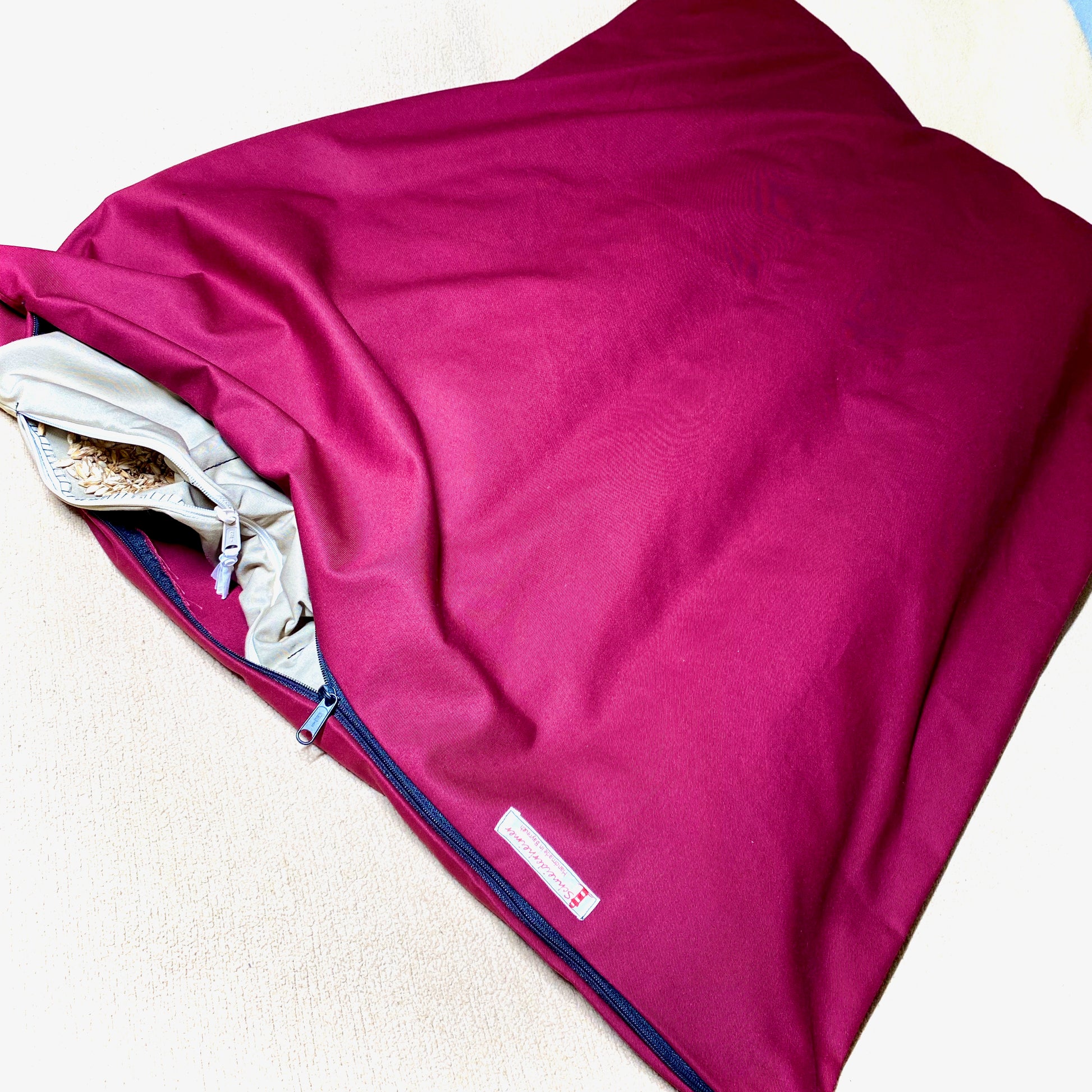 Zum Kissen fertigen wir in Ihrer Wunschfarbe einen passenden Bezug aus Köpertex-Funktionsstoff. Dieser Stoff ist bei 60 Grad waschbar und trocknergeeignet. Er ist extrem strapazierfähig und bietet dennoch einen hohen Tragekomfort.