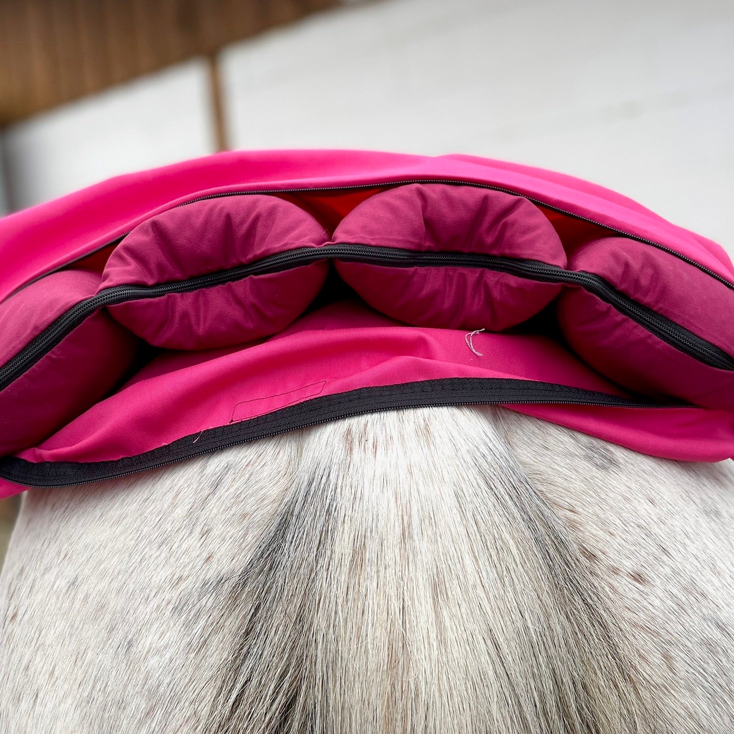 Unser Pferdekissen hat 4 Kammern mit Dinkelspelzfüllung vom regionalen Lieferanten. Die Füllmenge kann individuell variiert und der Dinkelspelz bei Bedarf bequem ausgetauscht werden.