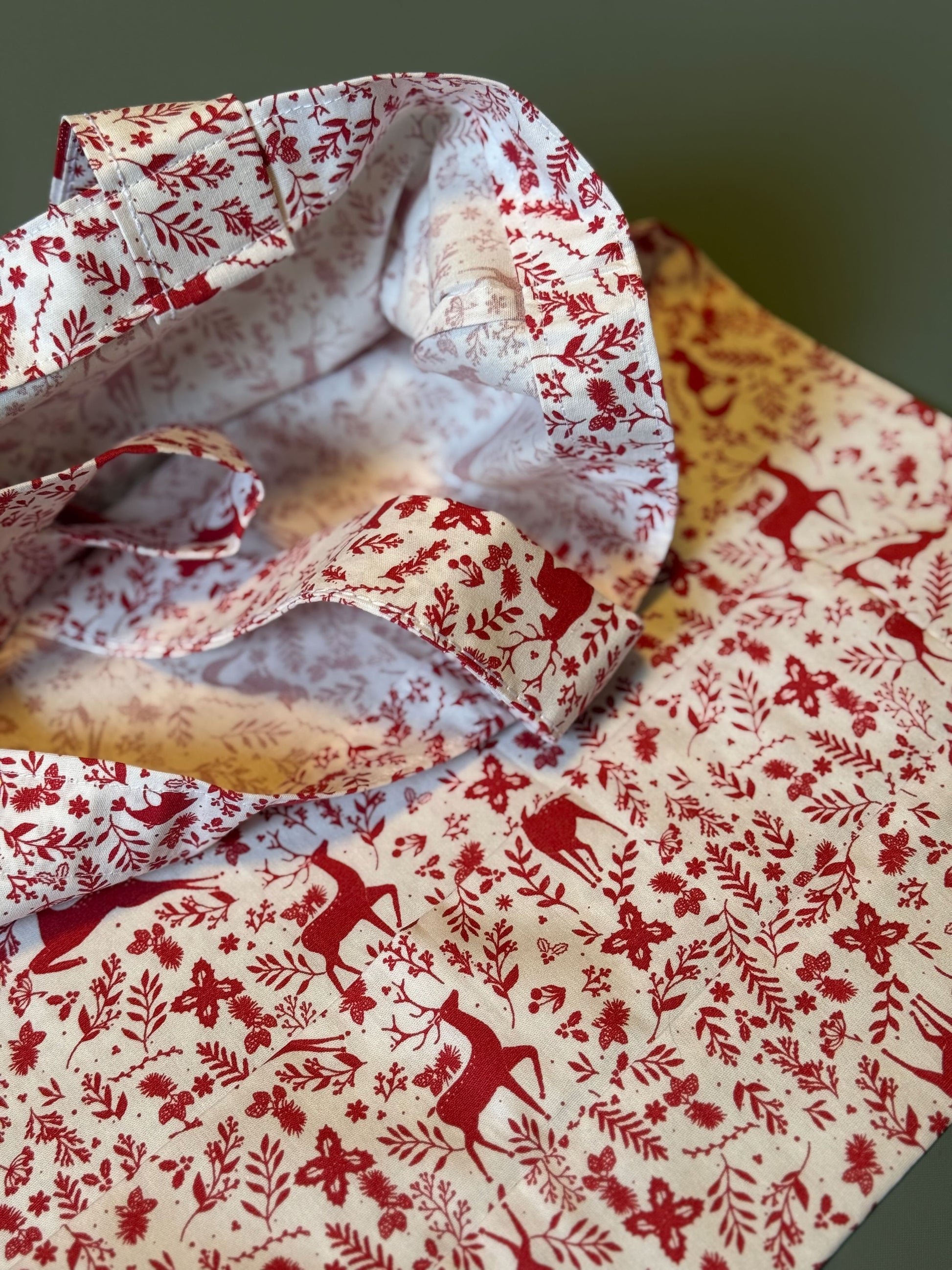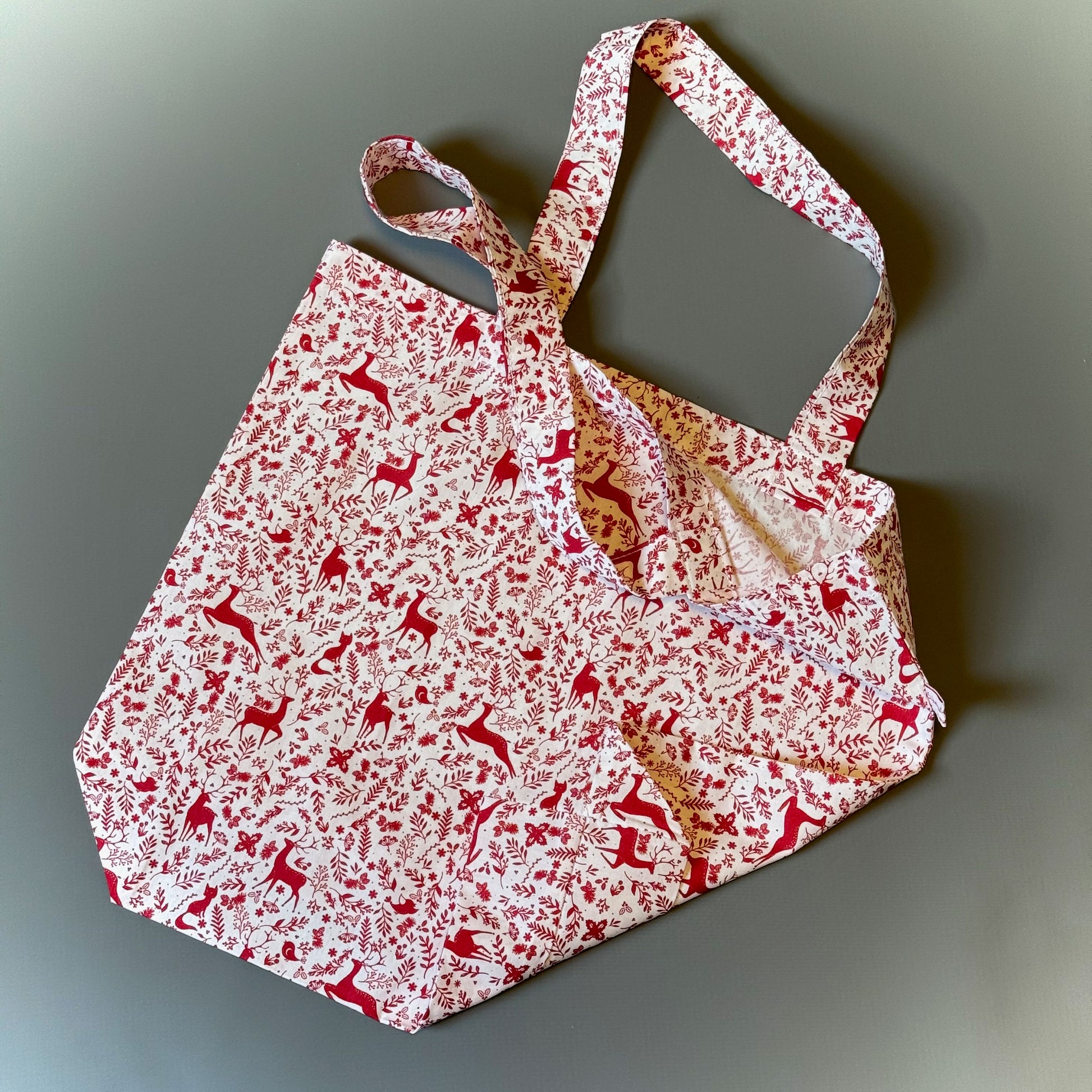 Diese leichte Einkaufstasche im Weihnachtskleid ist ein praktischer Begleiter für den spontanen Einkauf unterwegs und eine nachhaltige Idee, Ihre Weihnachtsgeschenke zu verpacken.